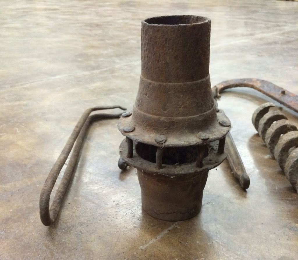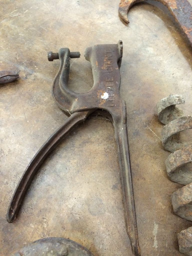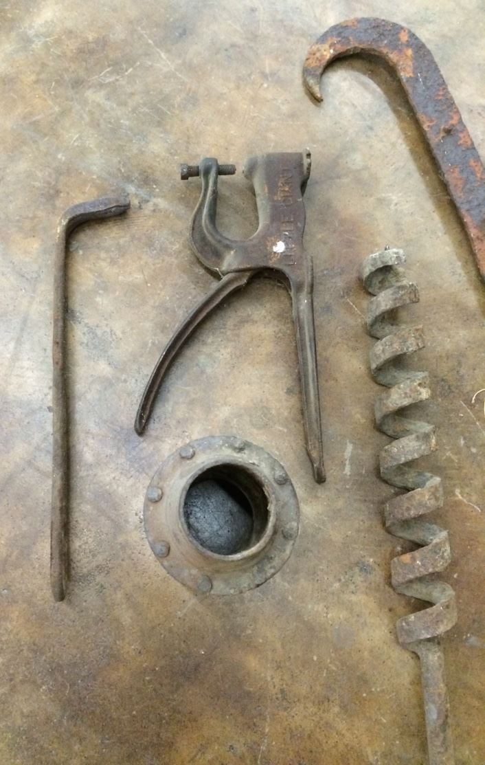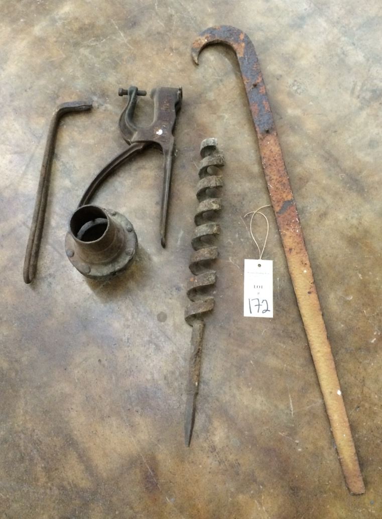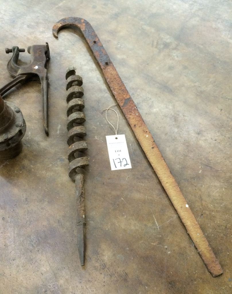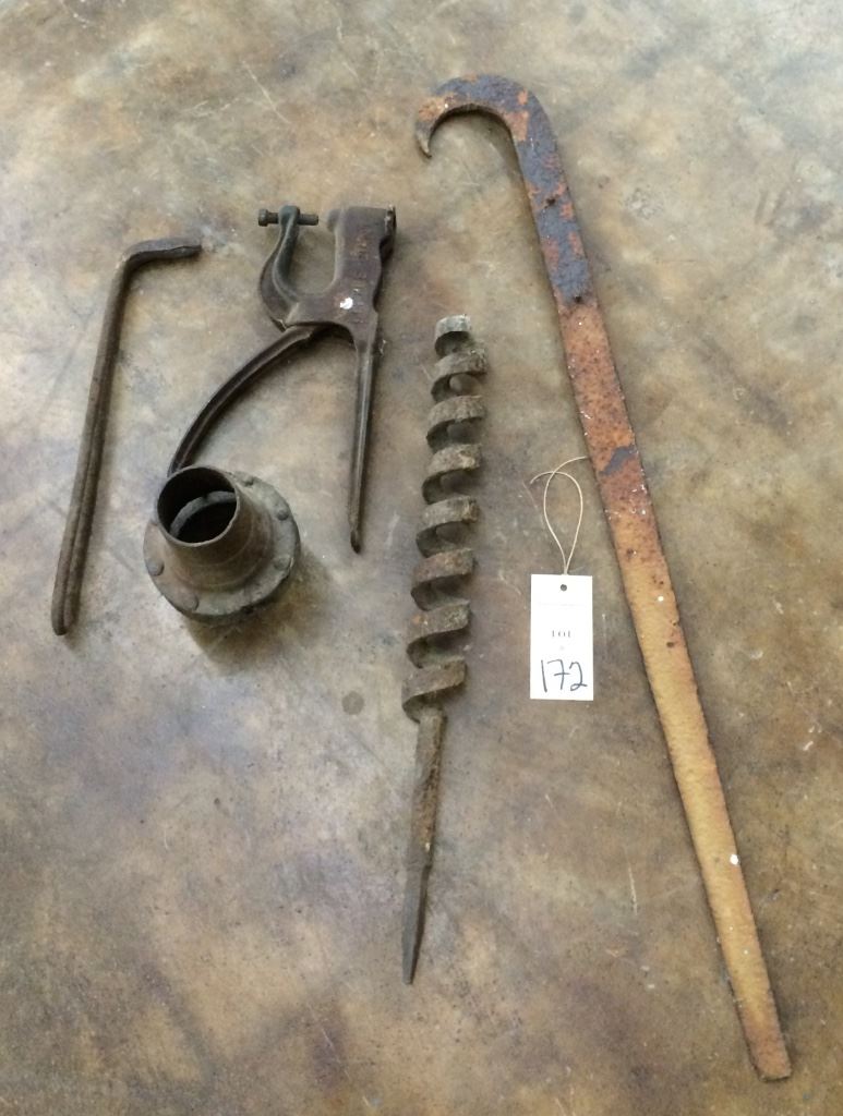 This group of “found” relics came out of the old Frontier Relics Museum (Orville Mickens estate). Mr. Mickens found most of the items in his museum while tromping around historical areas in Arizona and New Mexico. There is an old auger/bit, the main balance from an antique cotton scale, miner’s crucible tongs, a buggy wheel hub and an antique rivet gun. Please look at pics to see what all you will get. Shipping: There will be a $7 handling / packaging fee for shipping this lot. The actual cost of postage will be added on top of that.