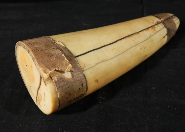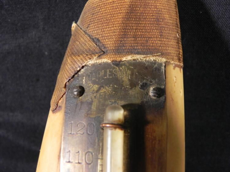 This is the tip portion of an antique ivory elephant tusk made into a desktop thermometer. It stands 8 1/2 inches tall. The ivory shows cracking, and is reinforced with two pieces of period tape at the top and bottom. The thermometer itself was made by Charles Wilder. It has a brass backing with temperature markings.
