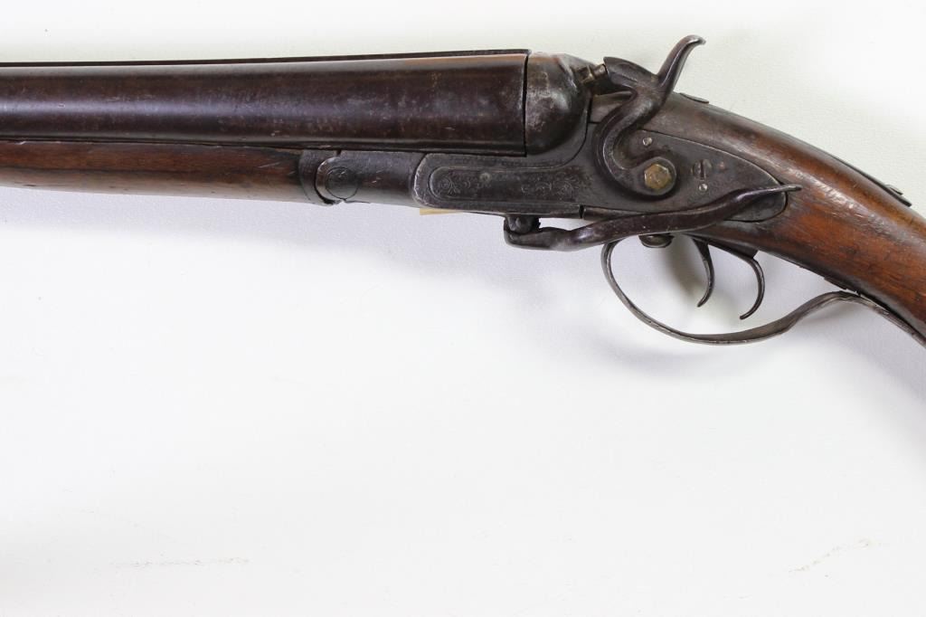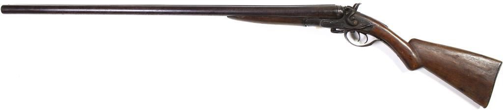 Antique J. Manton double barrel 12 ga. shotgun with exposed hammers with 32" barrels, walnut stocks, overall good to very good, rear stock moderately sanded, NO cracks or repairs, good functioning action. with exposed hammers with 32" barrels, walnut stocks, overall good to very good, rear stock moderately sanded, NO cracks or repairs, good functioning action.