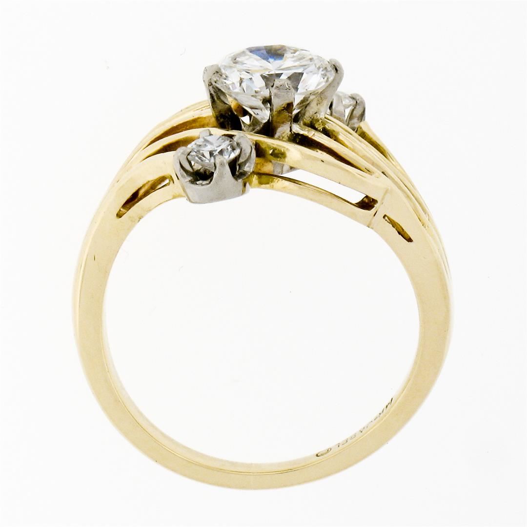 An anitqiue solid 14 yellow gold and white gold open swirl engagement ring. with 1 Gia certified round brilliant cut natural diamonds (G - SI1 ; 1.03ct), and 2 old european cut natural diamonds (G/H - VS1/VS2 ; 0.16ctw). The ring is size 5.5, weighs a total of 4.27 grams, and measures 14.7mm wide. Comes with all original relevant certifications.