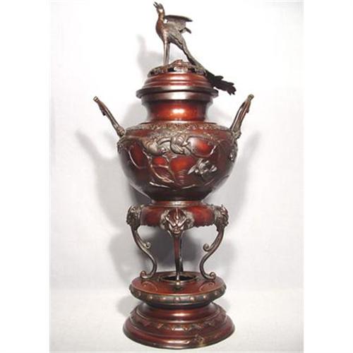 An ornate and decorative Japanese Bronze Censer bearing dark red-brown patina, comprising a distinctive pedestal base with dragon?s heads, ovoid vessel carved in relief with birds and trees, with dragon-form handles and surmounted by a pierced cover with a crane, Meiji Period (1868-1912). Measurements: 30 inches (76 cm) tall. Condition: in good condition except for damage to the base (please see the pictures) with very nice old patina.
