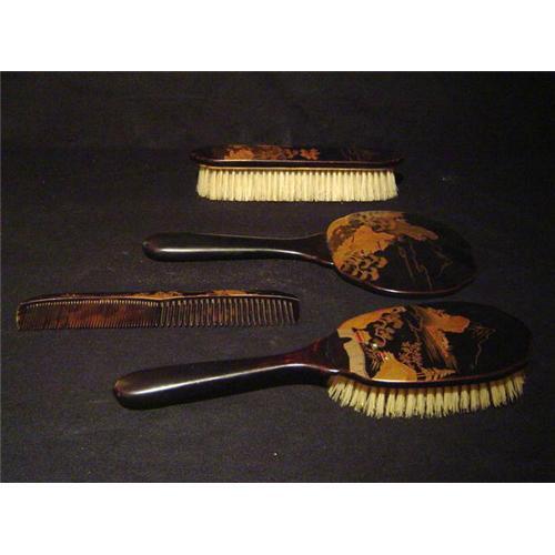 Circa. 1910 Exquisite complete set. All original, no defects of any kind. Brush and comb is black bakelite with inlaid mother of pearl. Gold enamel design. 4-piece set. Brushes are in perfect condition. Mirror has beveled edge. Long brush measures 7 inches by 2 inches. Mirror is 10 1/4 inches long. Mirror itself measures 4 1/2 inches x 5 1/2 inches. Comb measures 7 1/2 inches x 1 1/2 inches. Hand brush measures 10 inches long x 3 inches wide. Unique and wonderful! </td></tr><tr> <td> </td></tr><tr> <td>Reference #: JBDJ200</td></tr><tr><td>Condition:Excellent</td></tr><tr><td>Year:1910</td></tr><tr><td>Country:Japan</td></tr><tr><td>Title:Antique Japanese Export Dresser Set</td></tr><tr><td>Location:New York USA</td></tr></table>