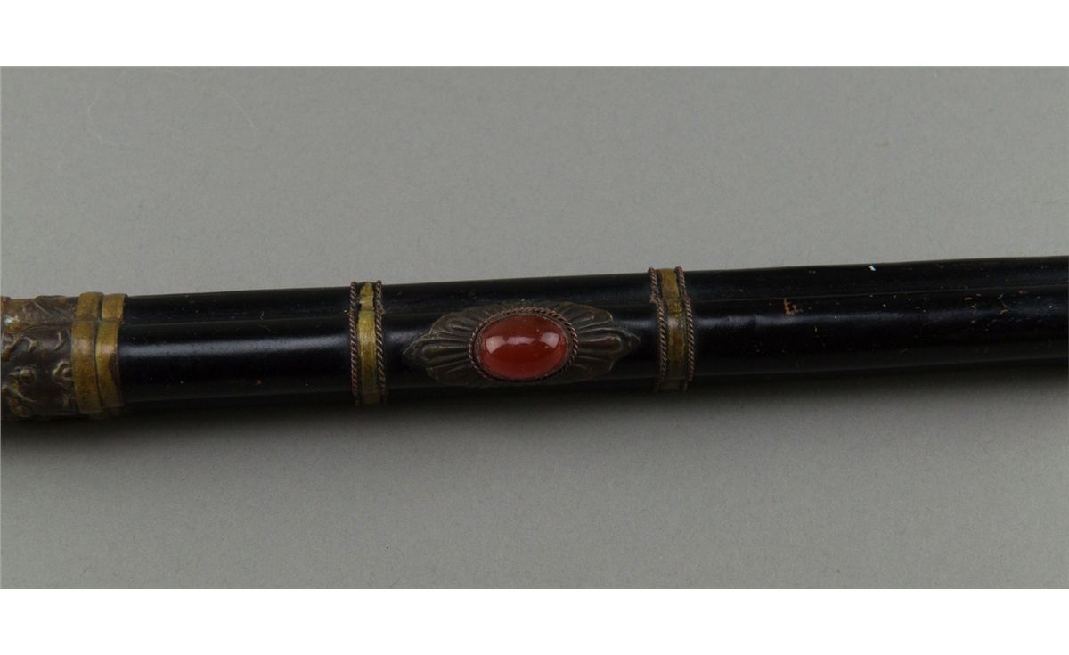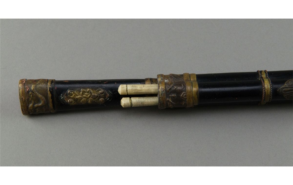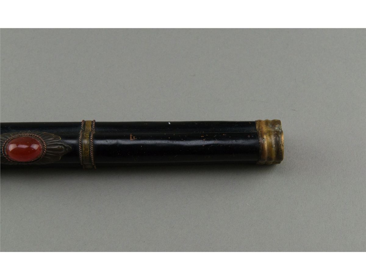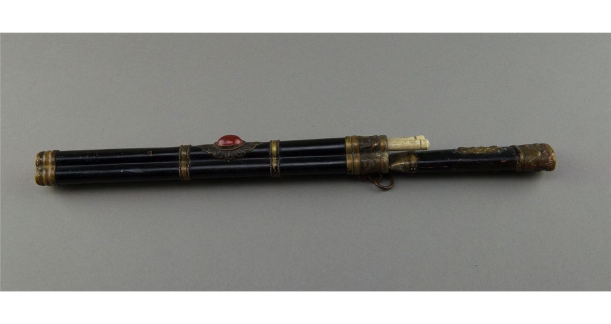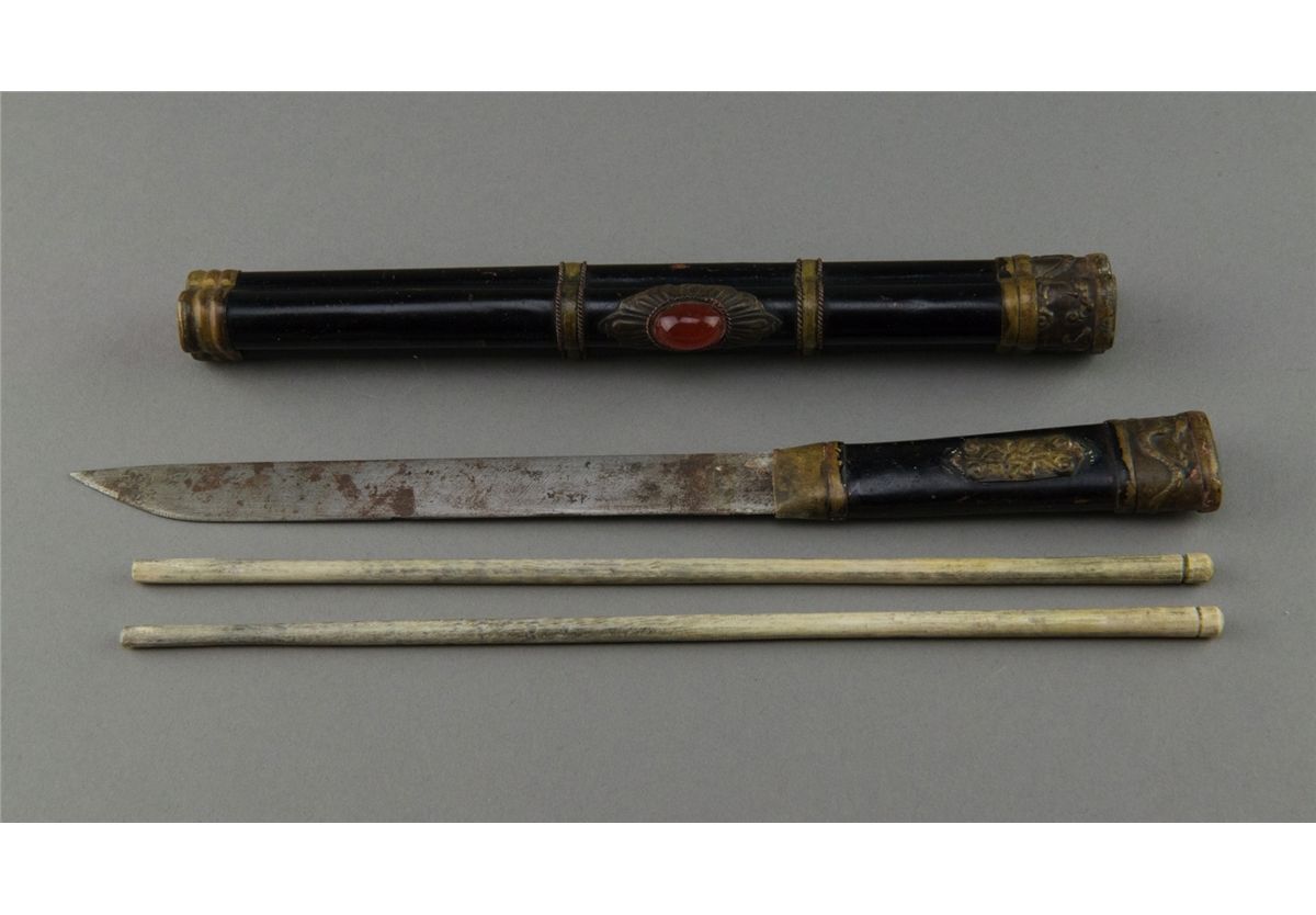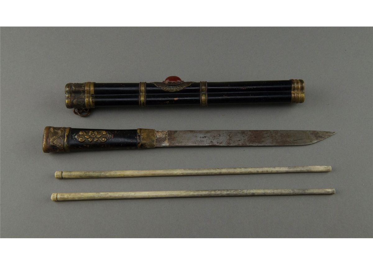 Possibly early 20th Century women's Japanese knife and bone chopsticks in black lacquer finished holder with bronze fittings and gemstone; H: 2 cm, L: 31 cm, 177 grams; Provenance: Ma Collection Toronto