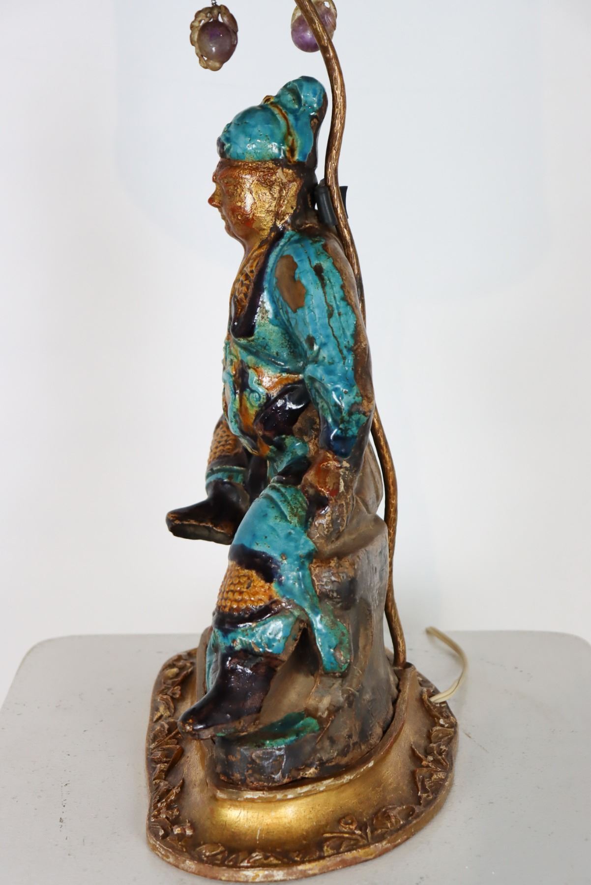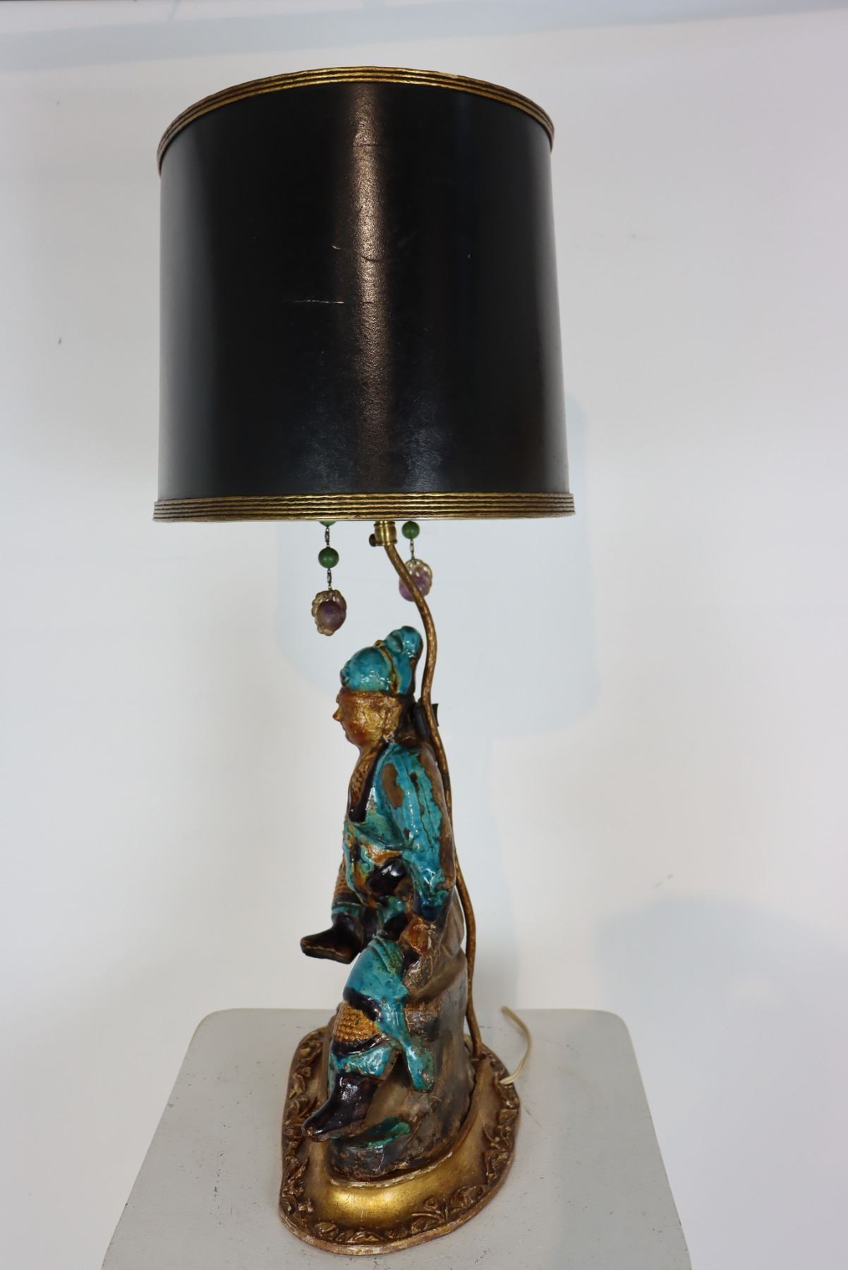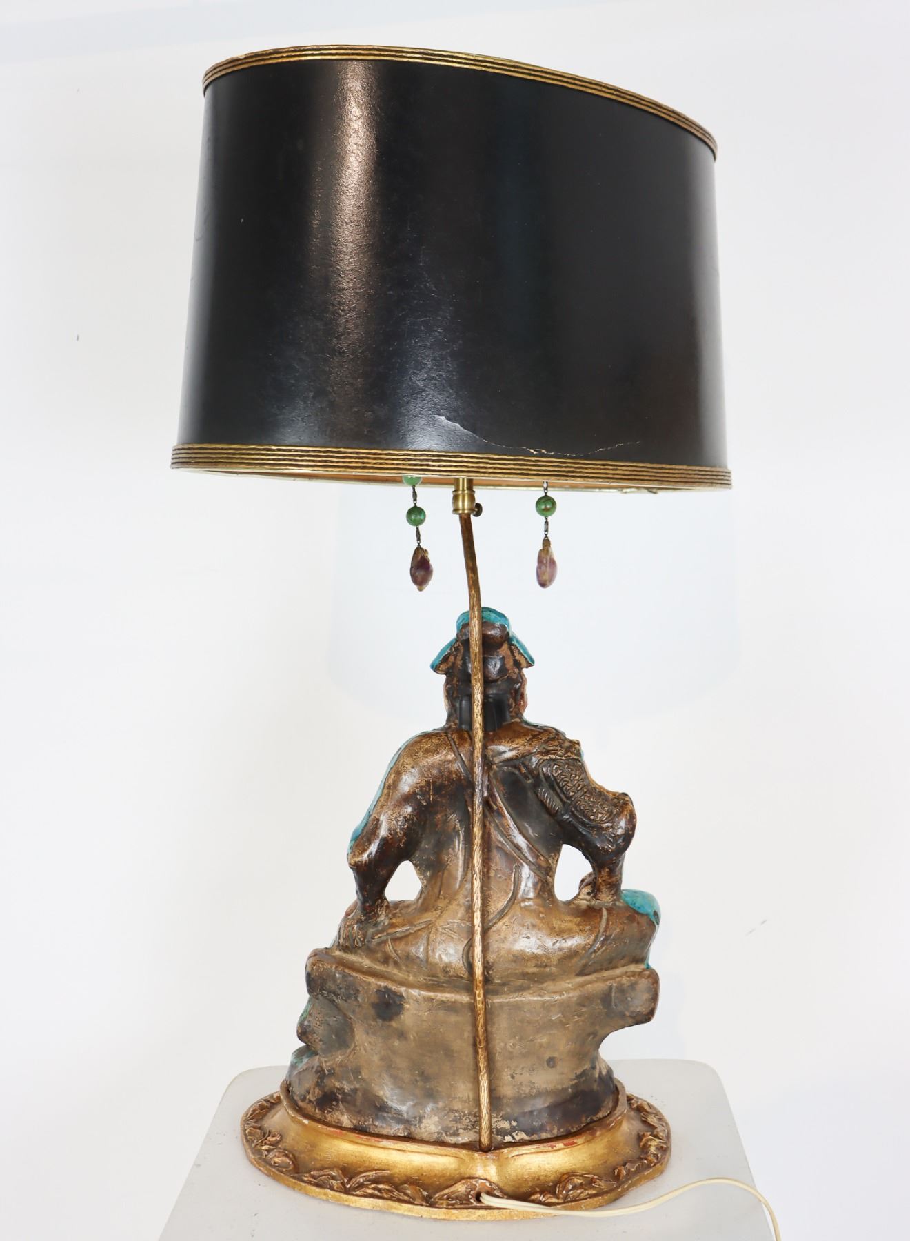 Figure converted, late 1800's. Japanese lamp with amethyst and jade pulls. As is.