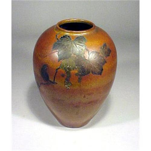 This is a wonderful vase in an elegant cylinder ovoid shape. The vase is bronze with a leaf and grape design along with a bird on a branch all enameled in gold gilding with tinges of silver. The bronze work is exceptional ? the highlights in the vase scream of antiquity. I suspect that this vase being marked ? MADE IN JAPAN ? most likely dates from before 1914. The condition is excellent no dings, no dents, no apologies. It measures 7 ¼?h with an overall approx. diameter of 5? and the base is 2 ¾? in diameter.