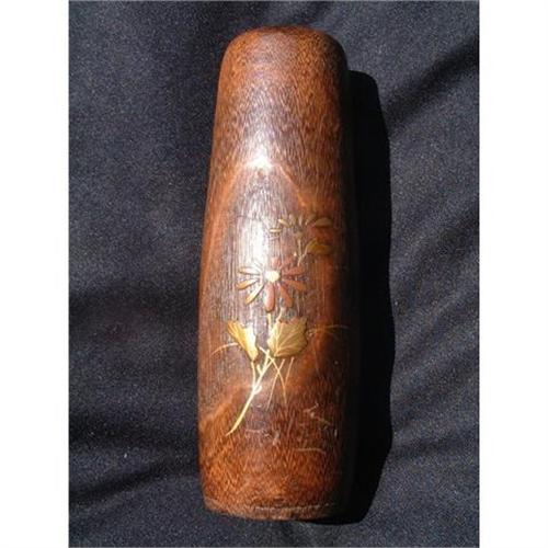 19th. century Japanese cylindrical wood vase with an inner copper container used for ikebana decorations. The wood is decorated with gold maki-e on lacquer displaying a floral design. Length: 8.6" (22 cm.). Estimated value: $3500.