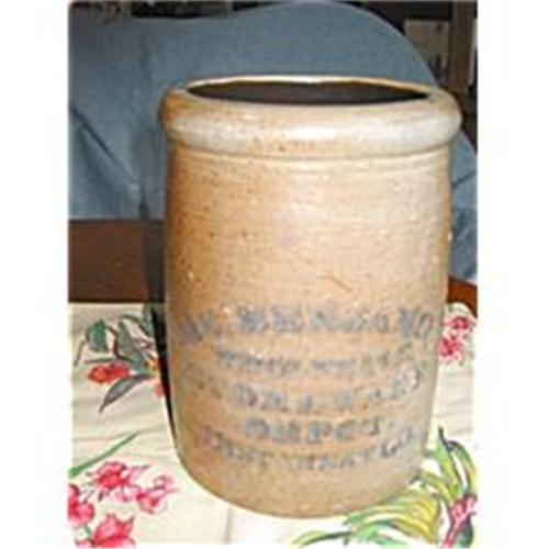 <table width="100%" border="0" cellspacing="0" cellpadding="4"><tr><td><em> AWESOME FIND!</em></td></tr><tr> <td width="100%"> Antique Jas Benjamin Saltglaze Crock. c.1800's according to Lehner's Book of Marks. Very nice antique stoneware saltglaze crock made by the Jas Benjamin Stoneware Co. It has the Jas. Benjamin Wholesale Stoneware Depot Cincinatti, O. mark in cobalt blue lettering on it. It is in good condition, no chips or cracks, and just one small black mark on the top rim, not sure what that is from. (one on-line site shows similar crocks listed for $4,000, and the McCoy book shows a very similar crock listed for $1,000-1200!). This will accomodate all your long-handled vintage utensils quite nicely if you care to actually use it for something. Most people just put these in a vintage cupboard for display since they are getting increasingly valuable. Looks great next to other saltglaze or stoneware crocks. Very hard to find the really old ones in this good of condition! If using paypal, you must be a verified buyer with a confirmed address. </td></tr><tr> <td> </td></tr><tr> <td>Reference #: stn06062</td></tr><tr><td>Condition:Good</td></tr><tr><td>Year:1800's</td></tr><tr><td>Maker:Jas Benjamin</td></tr><tr><td>Height:8.75</td></tr><tr><td>Width:6.75</td></tr><tr><td>Title:Antique Jas Benjamin Saltglaze Crock</td></tr><tr><td>Type:Saltglaze</td></tr><tr><td>Location:rochester hills, michigan</td></tr></table>