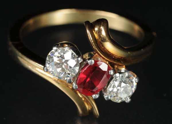Description Deco style with arthritic shank. Center stone is a ruby with two .5 carat very clean diamonds surrounding center stone. Condition (Excellent).