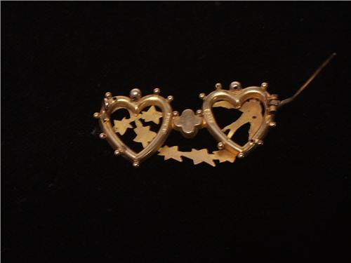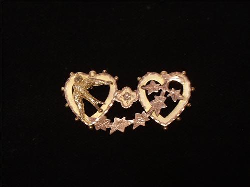 Description: English Hallmarked 9 K Gold Double Heart and Swallow Brooch.