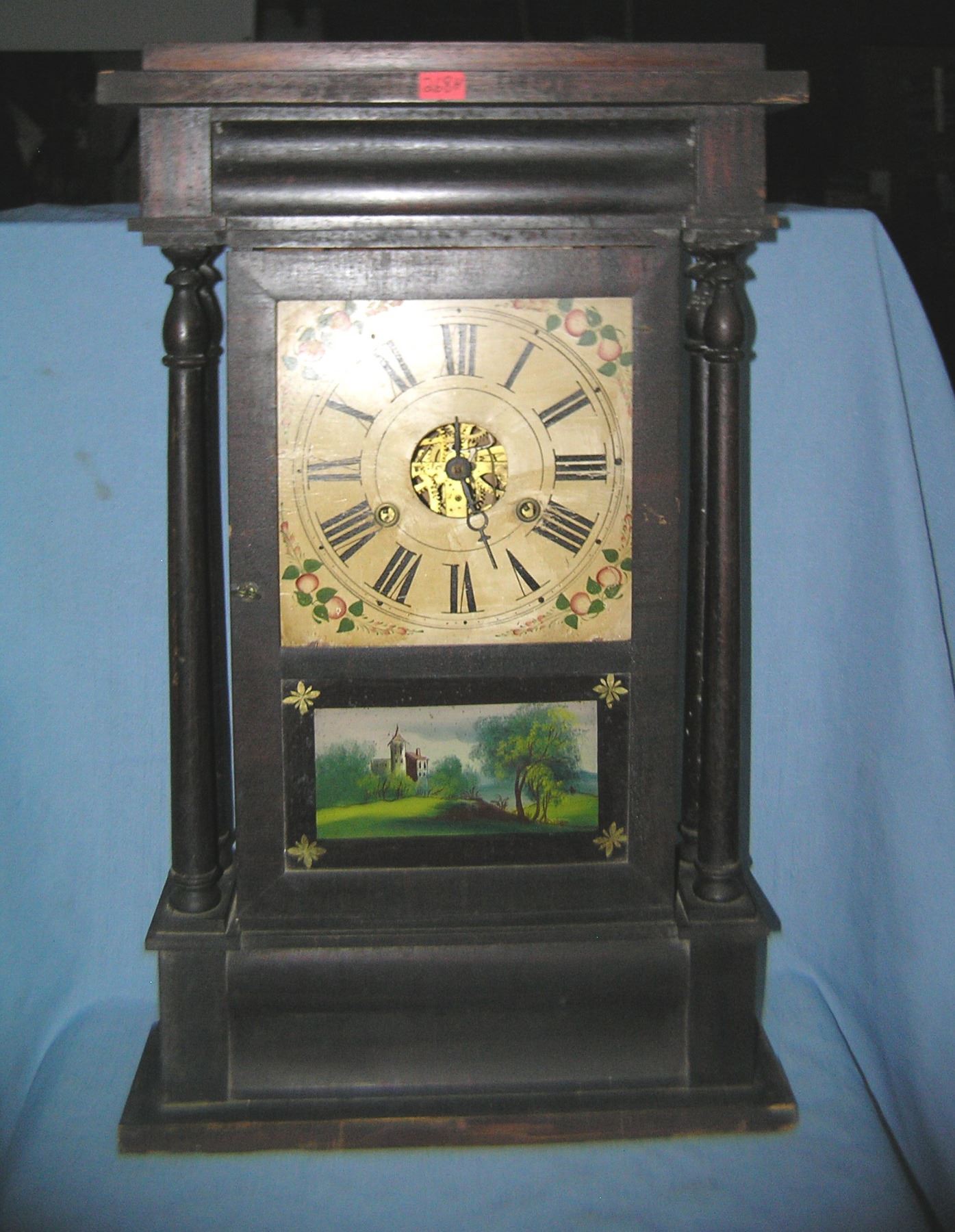 Antique Joseph L Smith reverse painted glass and walnut weight driven shelf clock sold and distributed by Smith and Dibble jewelry Co. Uniondale NY dated 1871 hand painted fruit decotated face plate clock appears to be in excellent condition est. value $1500.00-$2000.00