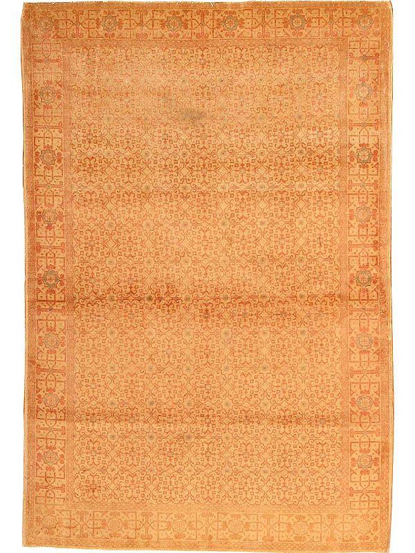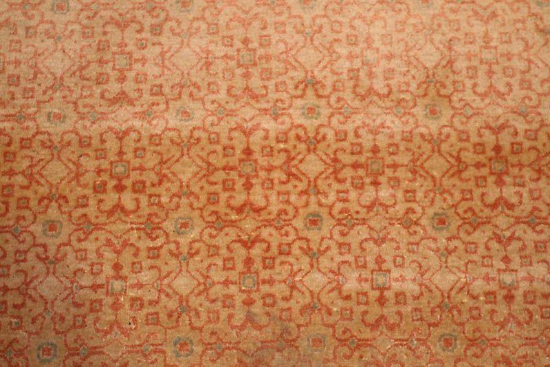 4.05 x 6.08 Circa 1920's Antique Kashan, Persia - A fine mesh of voluted cross-forms arranged as an allover design unfolds with minute and infinite precision across the surface of this sumptuous antique Kashan. A delicate 'Kufic' border based on the geometricized decorative Islamic script appropriately frames the field. Both the field and border are extraordinary within the Kashan production. They seem to follow Timurid designs from the very earliest attested period of Persian rug weaving. Despite the classic inspiration, the predominantly tan palette makes this piece a superior decorative carpet for contemporary use.