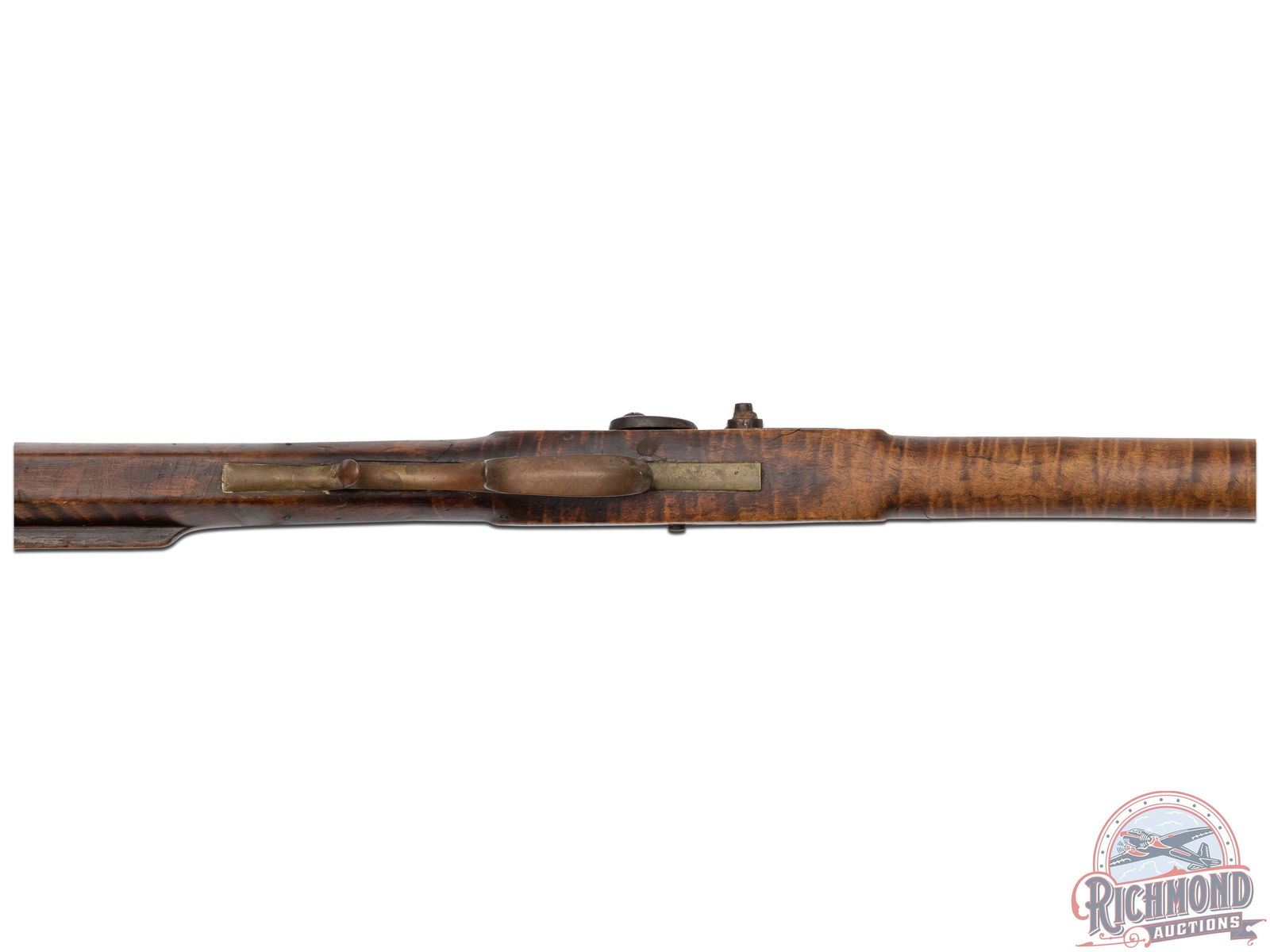 Overall fair with metal showing a brown patina and various usage wear marks. Wood has been cleaned with large chip missing at front barrel pin. Pitted dark bore with functioning mechanics.