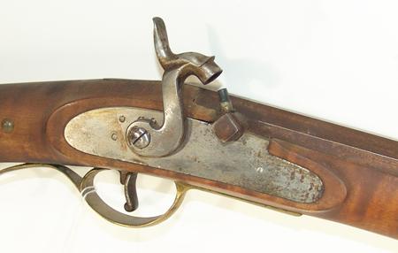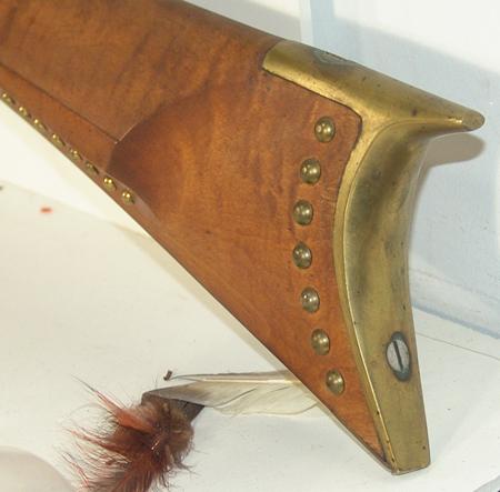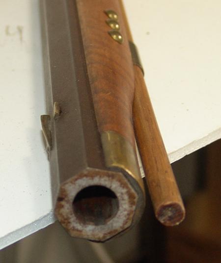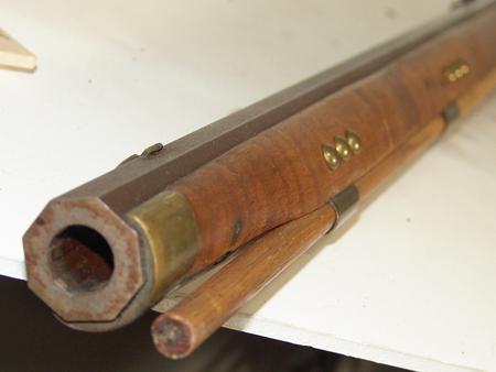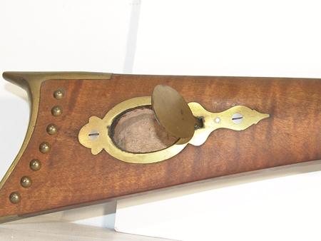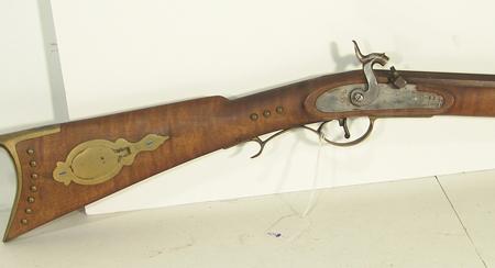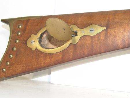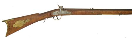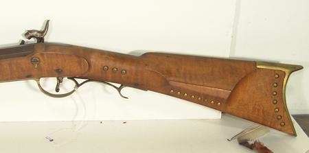 Old full stock octagon barrel percussion muzzle loader with dark tiger maple stock, fancy brass patch box, and double trigger. Condition: good, all original except for the ramrod. 44"