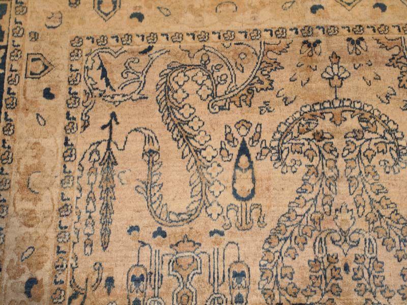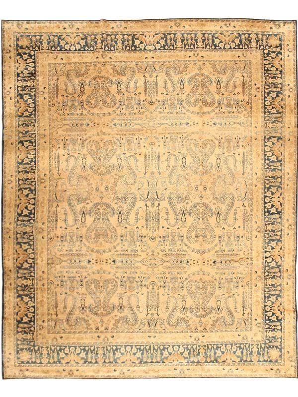 9.04 x 11.08 Early twentieth century Antique Persian Kerman Rug - This lovely antique Kerman has an allover design of delicately wrought azure blue garlands arranged as swags or volutes that unfolds across a soft saffron-tan ground. Small shrubs and flowers comprise the border, but against a rich blue ground that provides a strong, contrasting frame for the lace-like delicacy of the field. This piece is highly effective as a decorative carpet, not only because of its soft tonality, but also because of the transparent openness and finesse of the field.