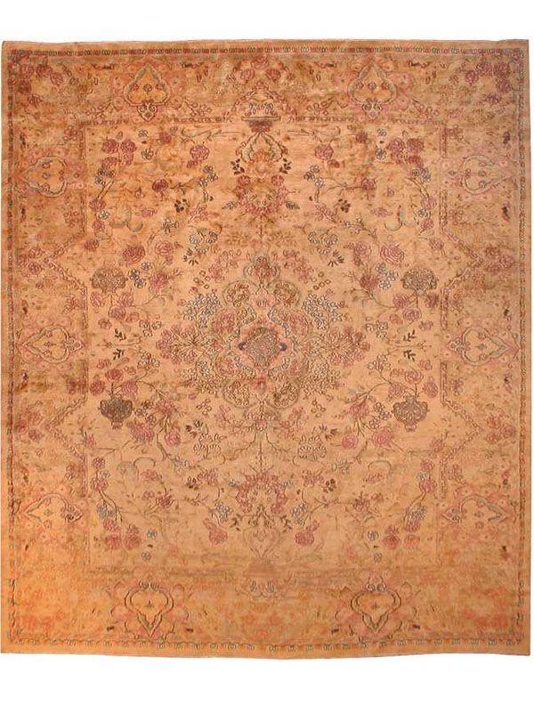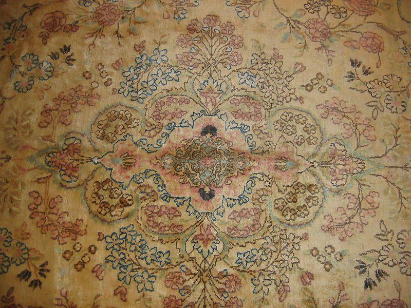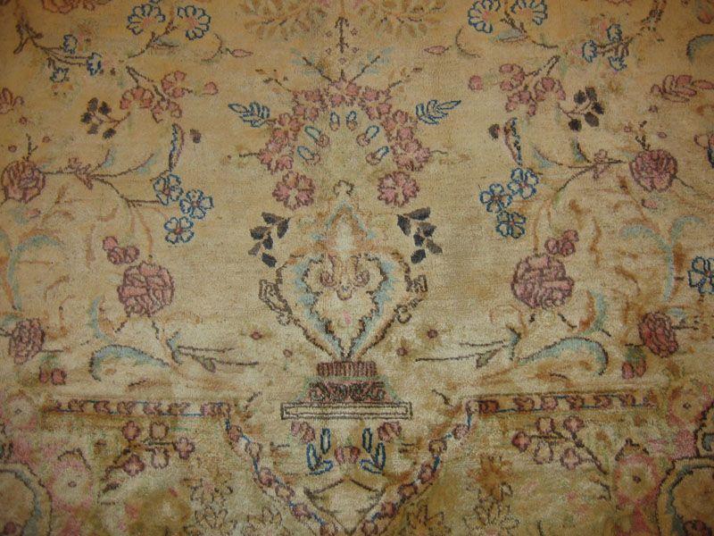 7.11 x 10.07 Early twentieth century Antique Persian Kerman Rug - While the central medallion, the stylized vases, and the arabesque border of this extraordinary antique Kerman exemplify the grand tradition of Persian weaving, its is at the same time a remarkable response to the elegance and style of the great Aubusson and Savonnerie carpets produced in France. The lovely sprays of naturalistic roses and above all the pale tan, cocoa. and lavender coloration are hallmarks of classic French carpet design. Here they enter into the Oriental tradition with consummate grace and intelligence to produce a result that is as rare as it is beautiful to behold.