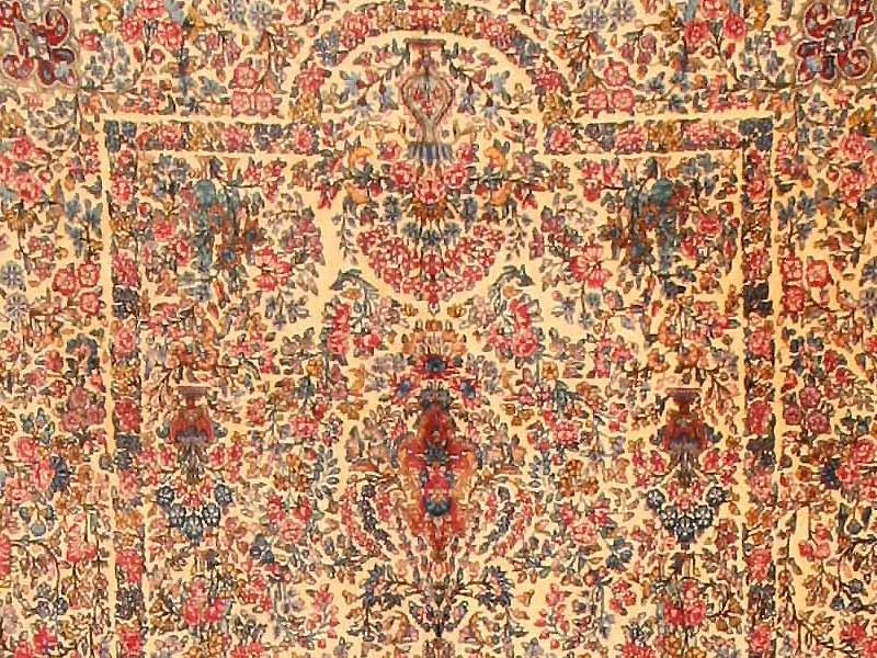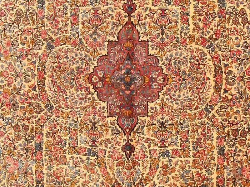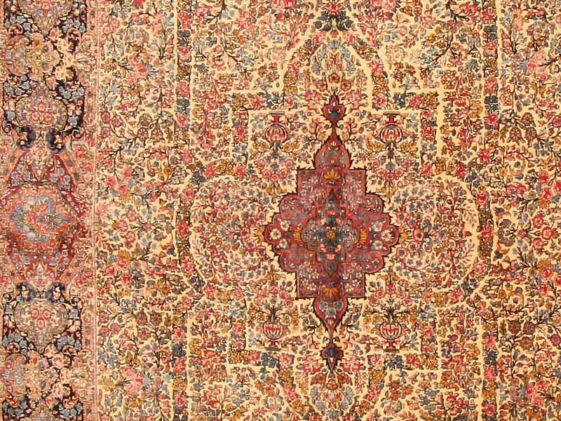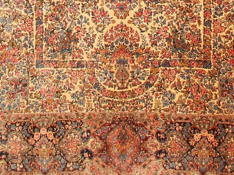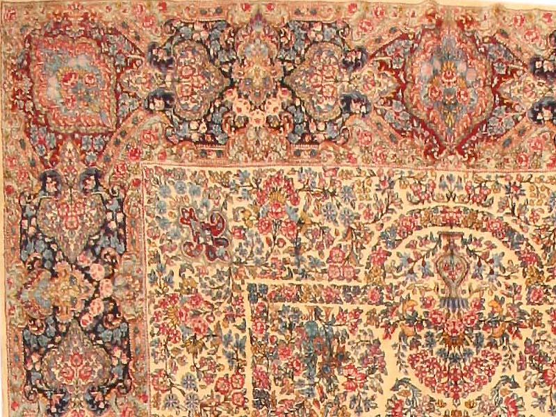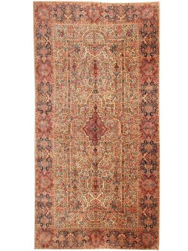 9.09 x 19.05 Late nineteenth century Antique Lavar Kerman Rug, Persia - A cruciform medallion in violet mauve sits amidst a lavish profusion of flowering vines and branches on this opulent antique Lavar Kerman. This floral array is set against an ivory ground that is so dense, that little of it shows through. Still, the use of color in the floral detail is carefully controlled in order to articulate bands that organize the larger design. The form of the medallion is echoed on a larger scale, while additional bands create a larger frame for the field with indented niches at either end. The myriad floral elements of main border are similarly arranged through the use of color the articulate a series of grand cartouches that frame the field while preserving its palette and design texture.