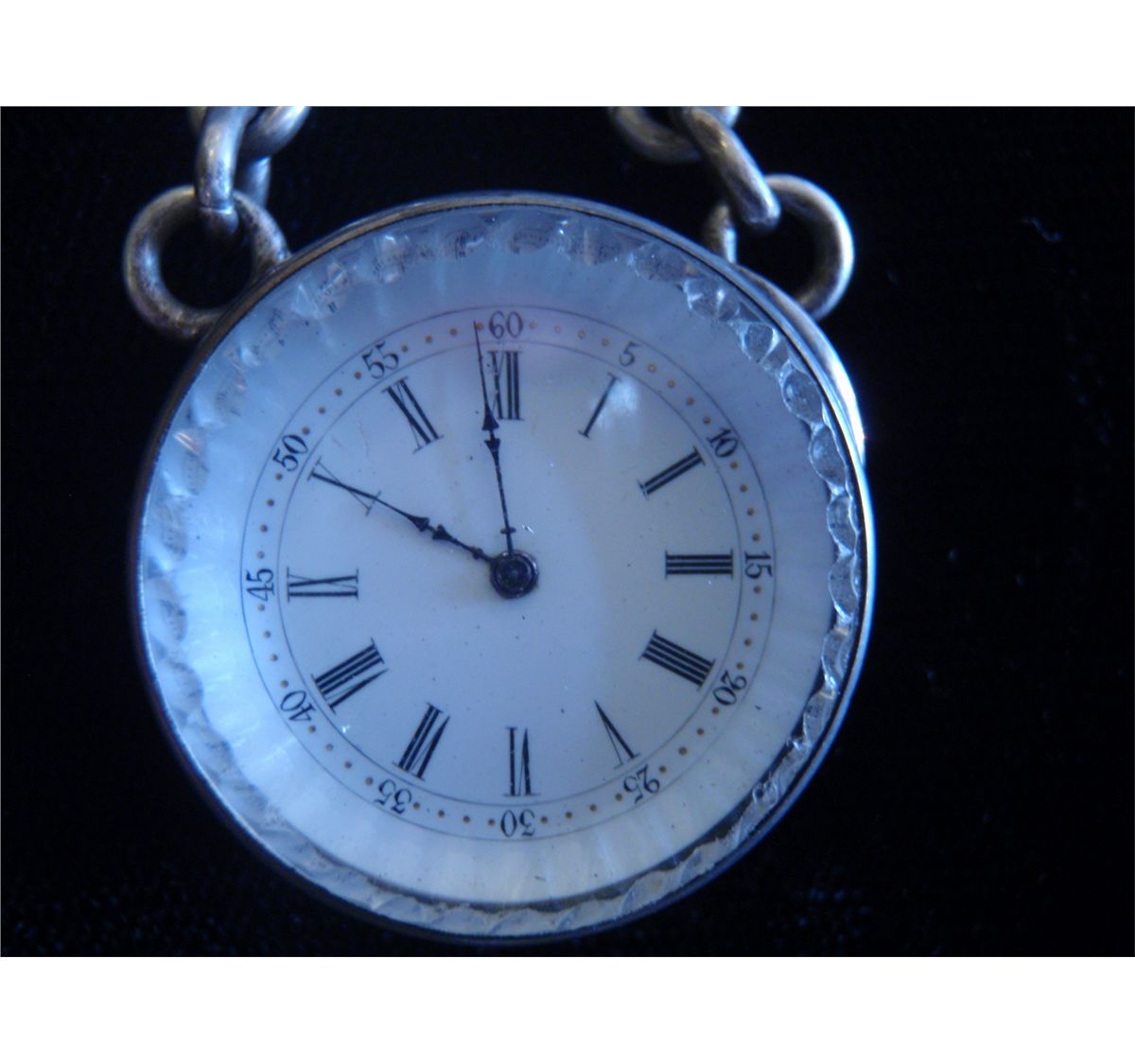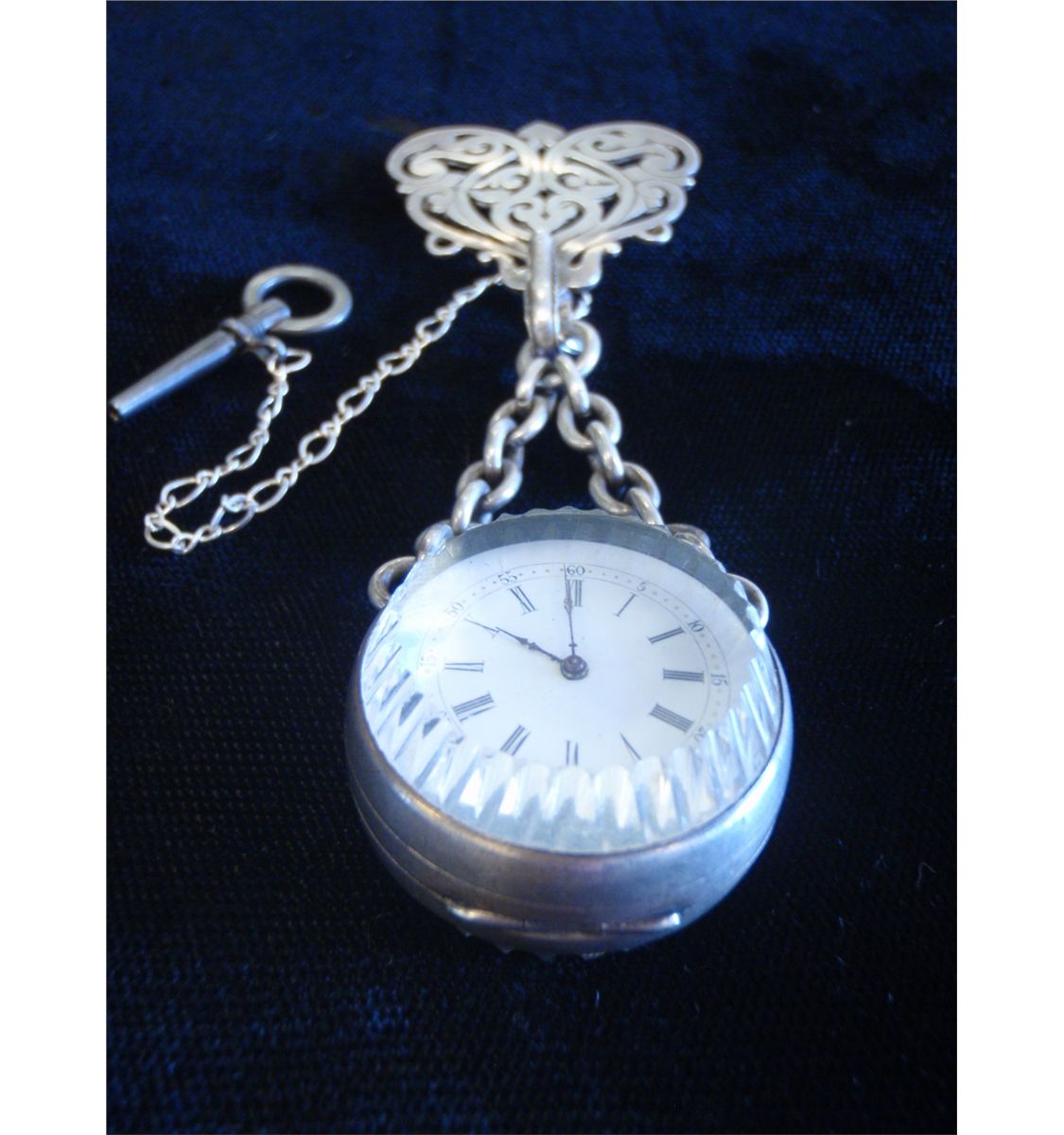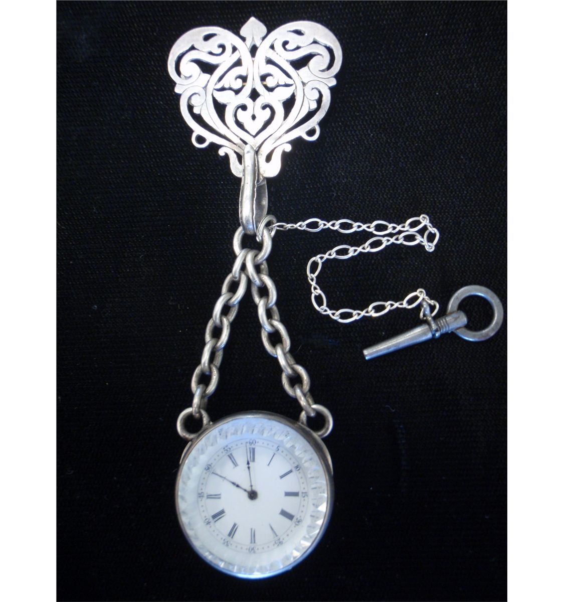 Lady's size crystal front & back watch. Thick crystal. Key wind and set watch. White dial with Roman numerals & Arabic numbers on outside of roman numerals . No maker's marks on movement, dial or case found. Attached to a Sterling silver pin. Please study our pictures for further description.