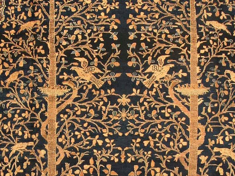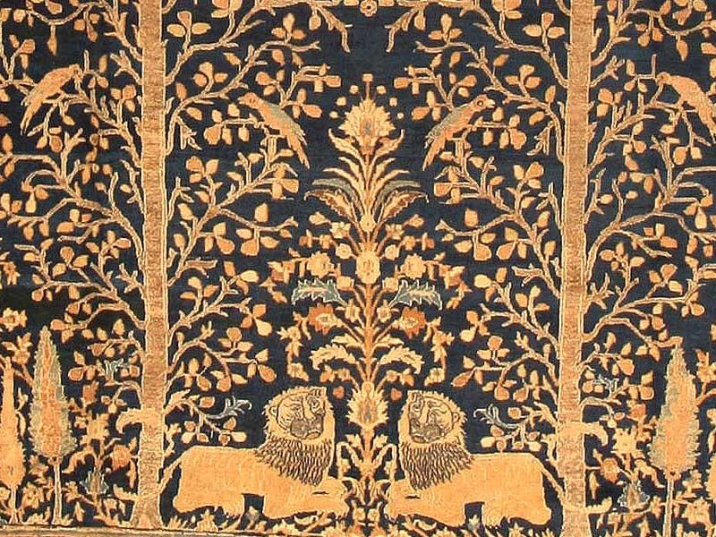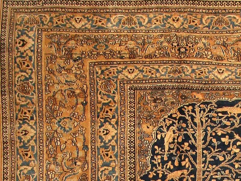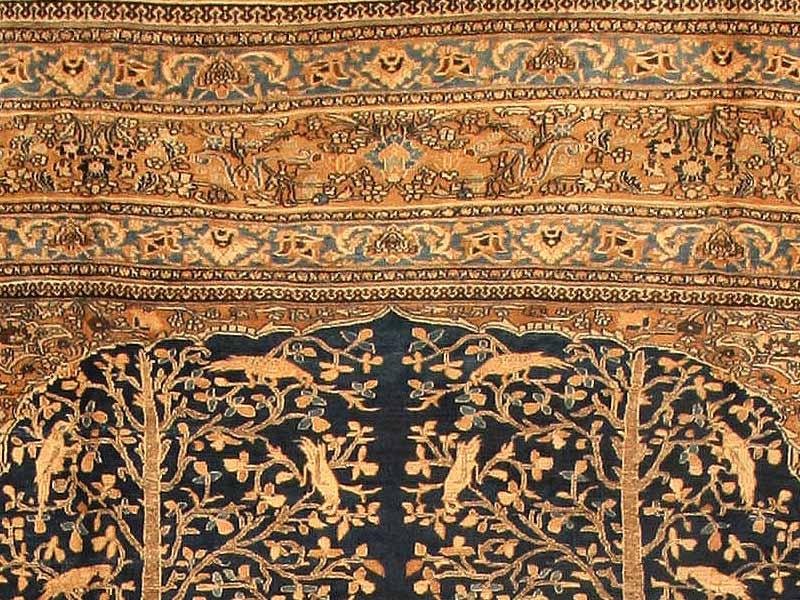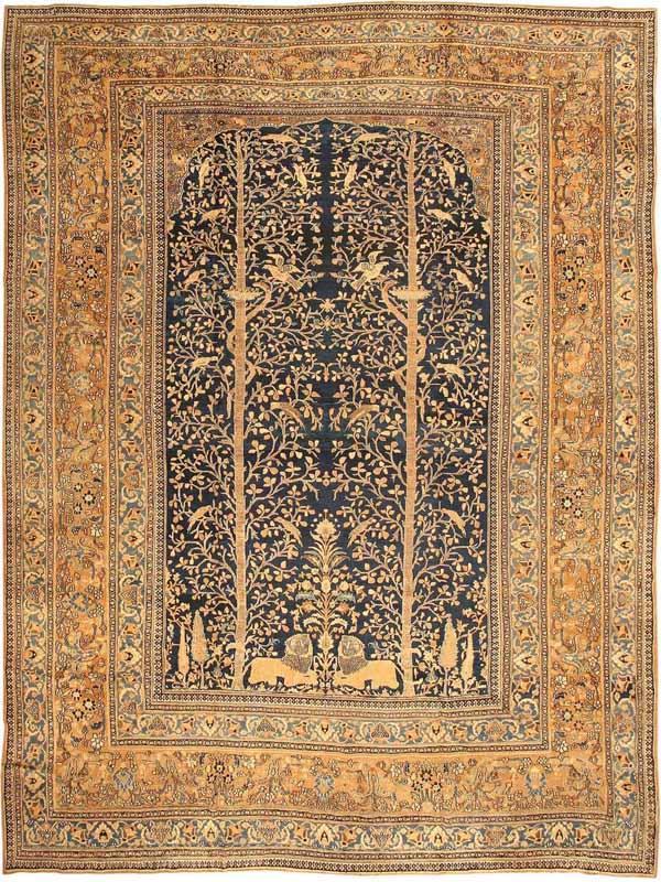 13.03 x 18.04 Circa 1900 Antique Khorassan rug from Persia - This magnificent antique Khorassan combines two great classical Persian rug traditions - that of the garden carpet and the prayer rug. Tall pillar-like trees rise up from the landscape as their leafy branches with pecking birds fill out the surrounding space. Lions recline at their trunks amidst smaller cypresses. The trees do double duty as columns for the prayer arch above. The prayer niche here is actually a window that opens on the a view of paradise in the form of a garden. Elegant vinescrolls on a golden ground comprise the borders, providing a framing contrast to the blue-ground field.