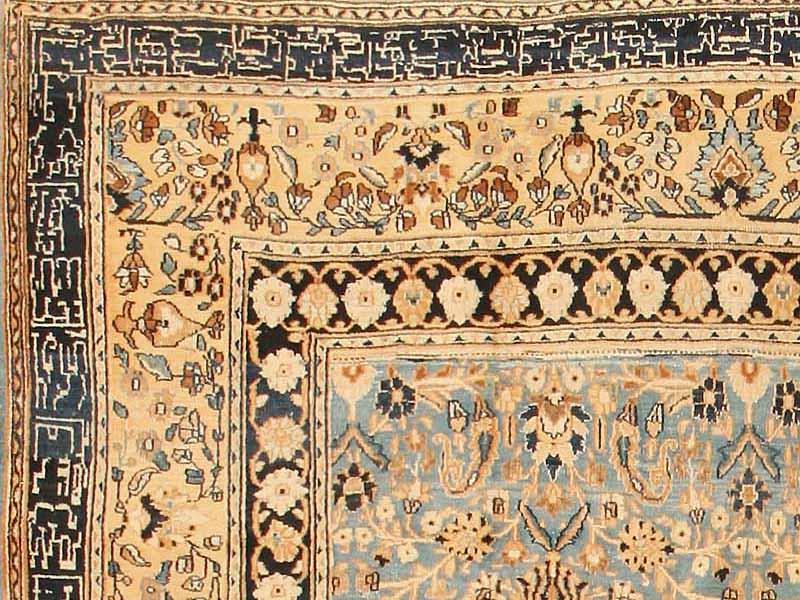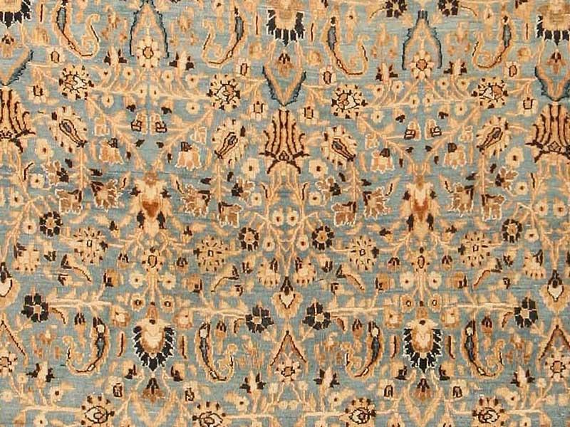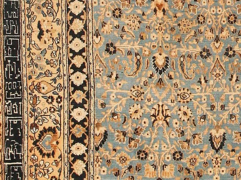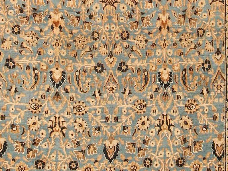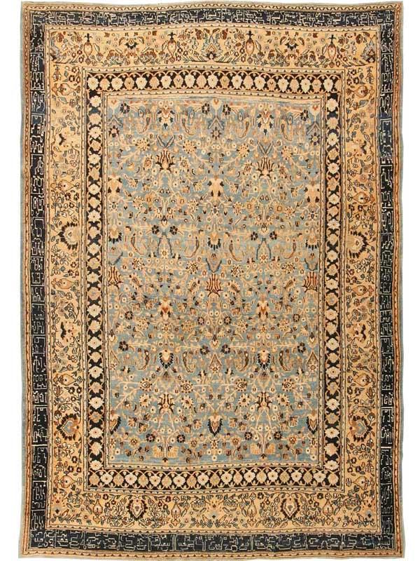 8.06 x 12.06 Early twentieth century Antique Khorassan Persian Rug, Persia - A lush profusion of flowering vines and palmettes unfolds all across this exuberant antique Khorassan. The density and excitement of the design is nicely offset by the softness of the palette, with its ivory tones set against pale blue, with sparing use of brown as a punctuating accent. This carefully controlled contrast of light and dark recurs in the border system, providing a unified but framing closure for the field composition.