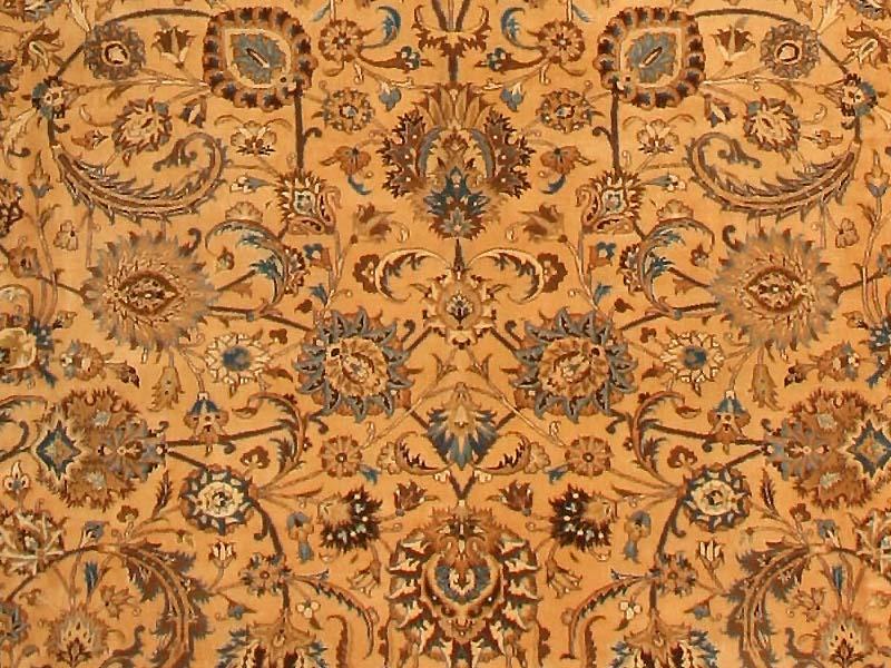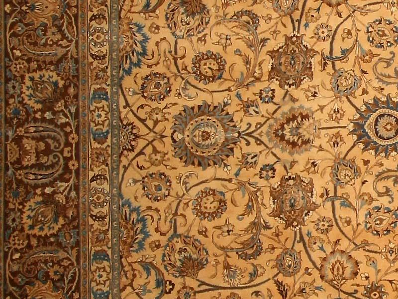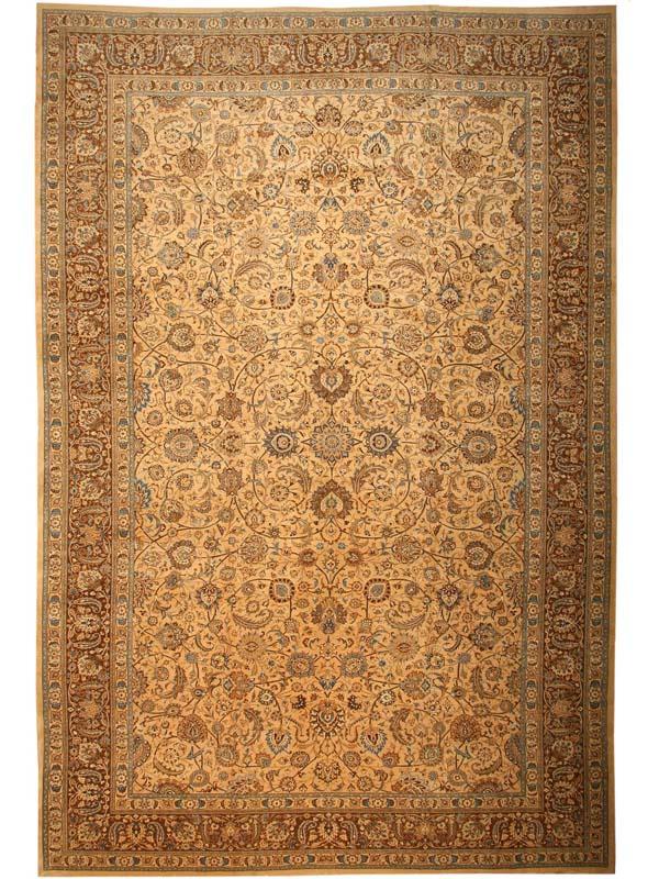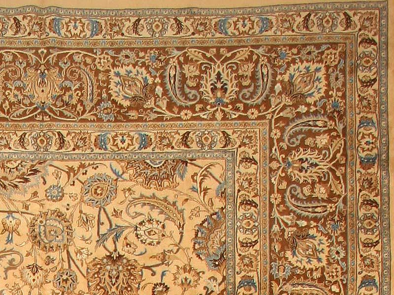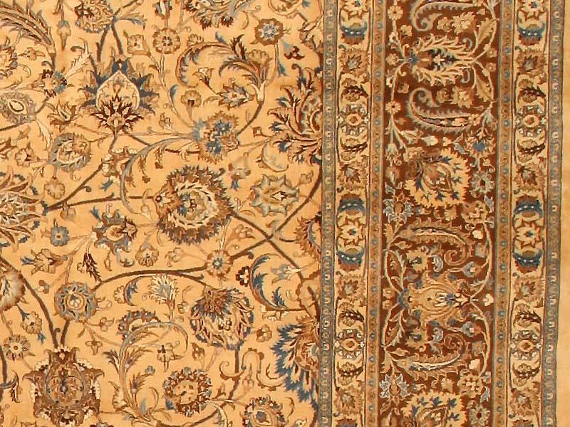 16.00 x 24.00 Late 20th century Antique Khorassan Persian Rug, Persia - Gracefully swirling spiral vinescrolls burgeoning with palmettes, curling leaves , and small flowers spread across the field of this stunning antique Khorassan. The exuberant details in shades of light blue, tans, cocoa, and ivory nicely complement the soft champagne tone of the ground. The cocoa ground border provides an effective contrast while still utilizing forms and colors like those of the field.