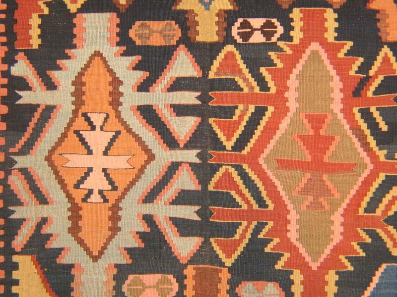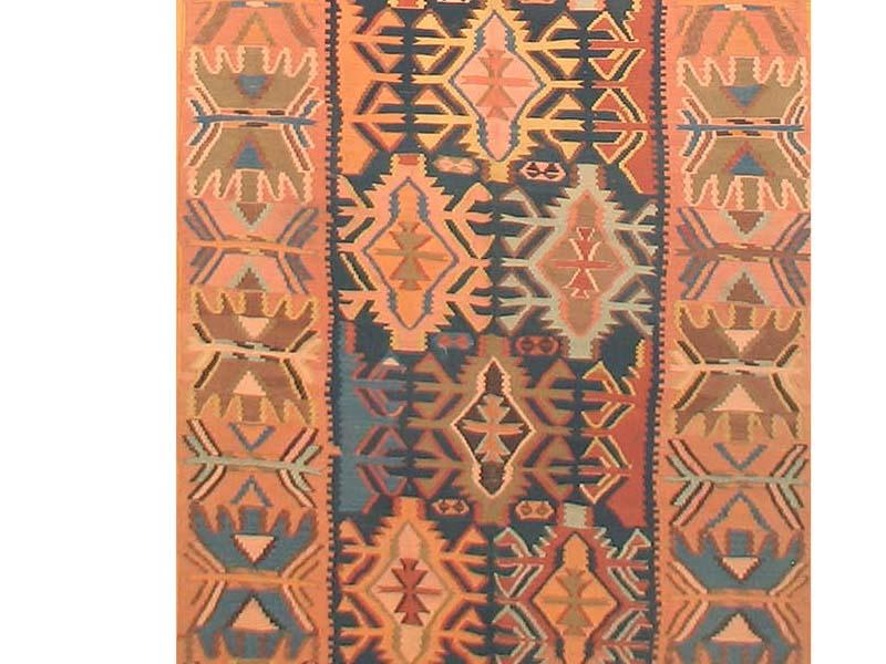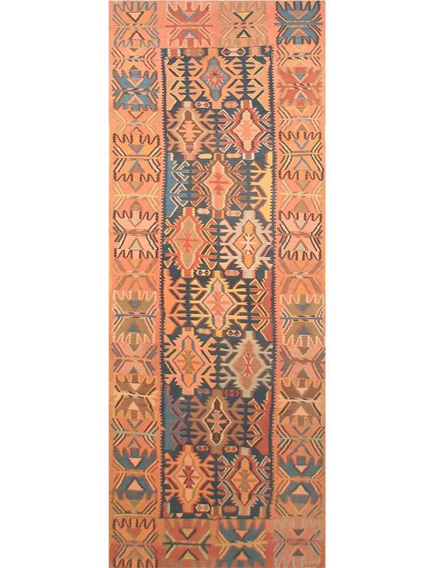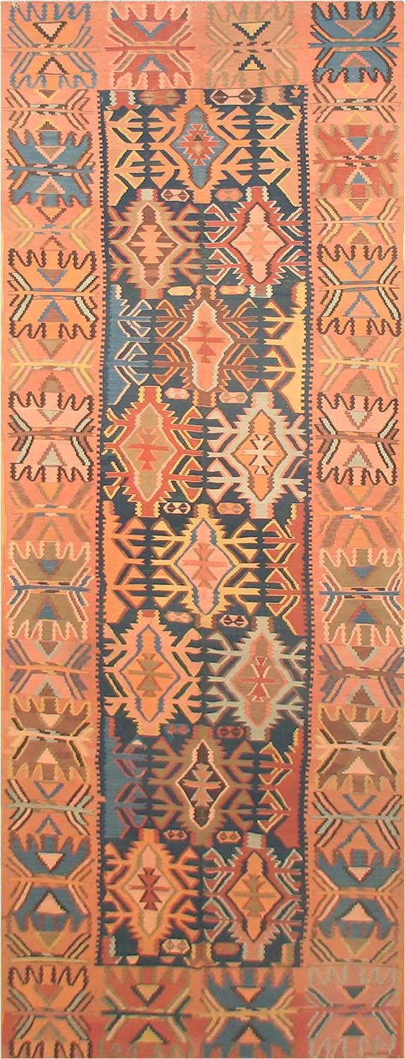 5.02 x 16.02 Nineteenth century Antique Persian Kilim Rug - Antique Turkish or Anatolian kilims are prized for their highly graphic geometric designs and their rich color effects. This one has a spectacular array of shield-like medallions set boldly against a dark blue ground, and a powerful border design as well. But in place of the strong colors that such kilims often display, this one has a lovely range of brick, mauve, taupe, olive, and powder blue tones that makes it a supremely decorative piece in a contemporary setting.