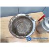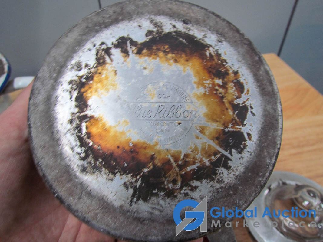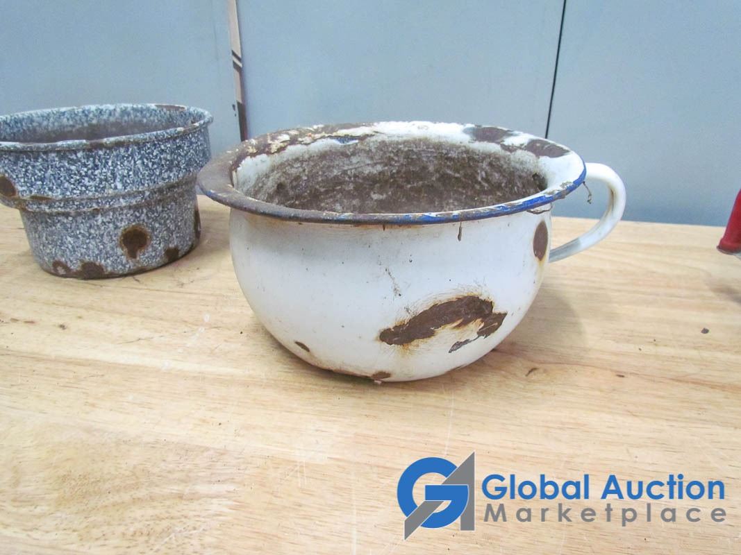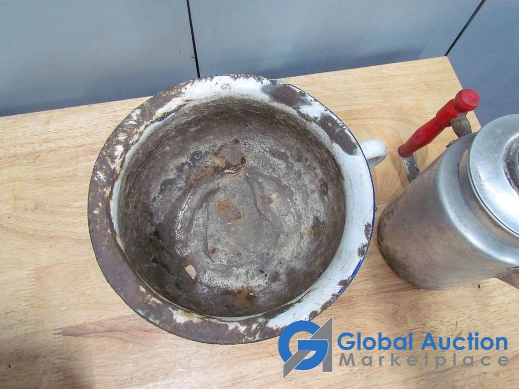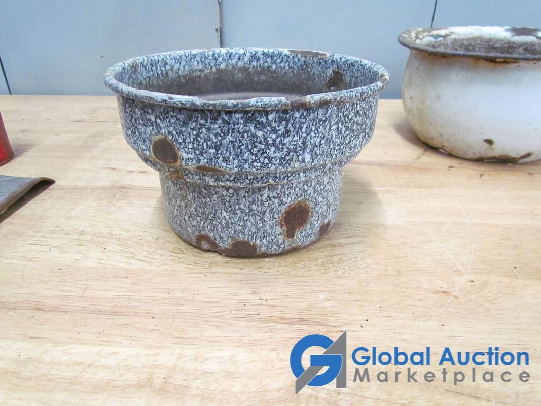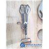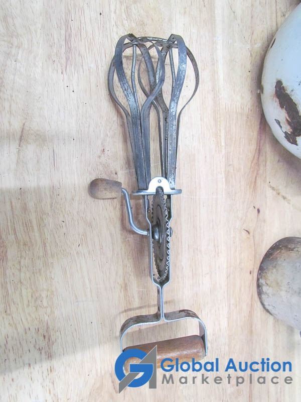 Egg beaters, kettle, grater, Blue Ribbon tin, enamel pots.