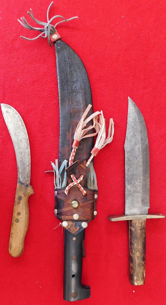 Antique Knife Collection, bowie is c. 1800s. Made of wood, steel, brass and leather, the items measure from 11.5" long to 20" long. Western USA & Belize. Machete is a Collins from Central America. Condition: Good, see images. Shipping: $35.00 w/insurance and signature, due to length.