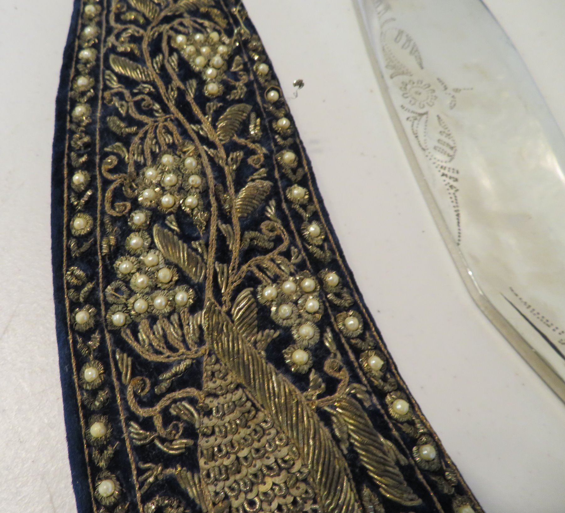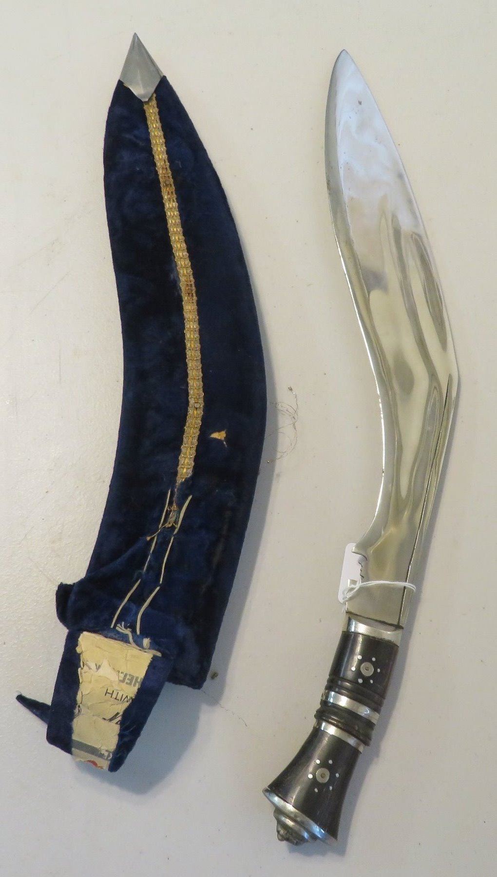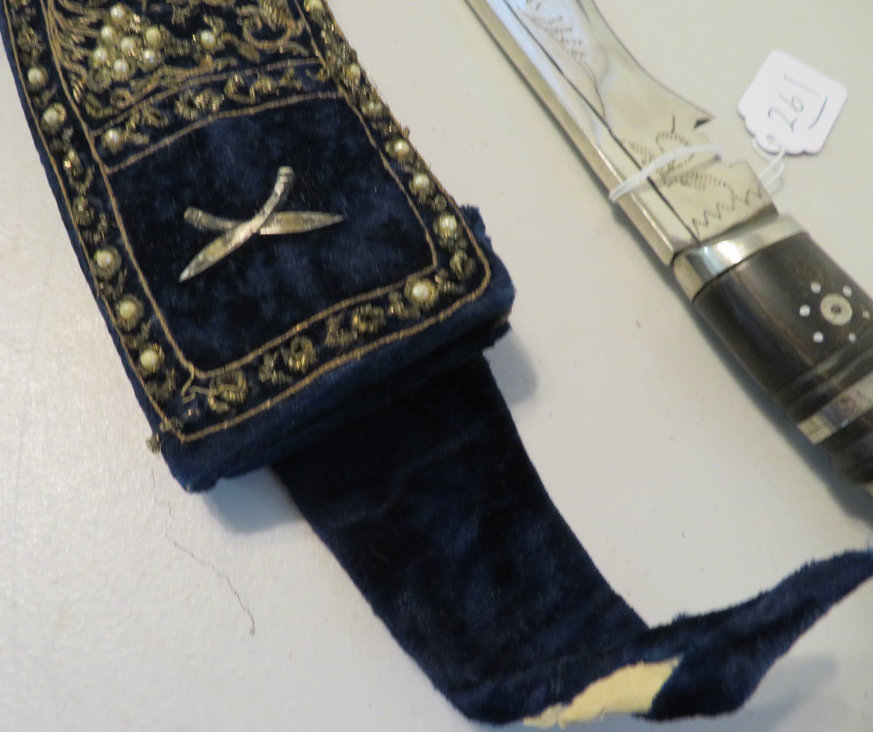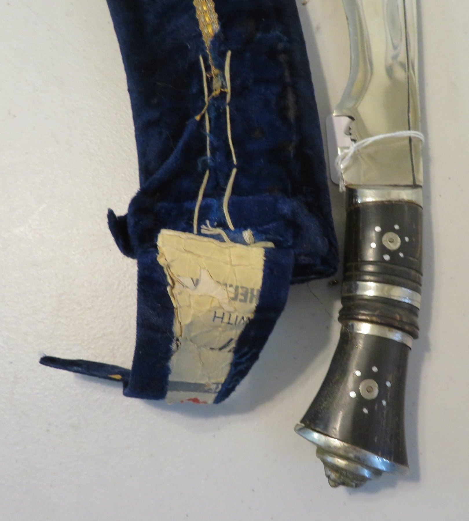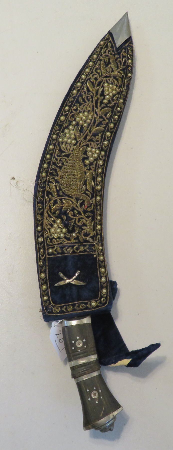 Antique Kukri Knife w/Silver Threaded Sheath, c. 100 years old, the item is made of horn, steel, metal, cloth, wood, silver thread and possibly pearls, the item measures 21" x 3 1/2" x 2" overall, with a 15 1/2" blade. India. Fine engraving on one side of this large knife, includes "India" and other designs. Very fine, blue sheath with heavily embroidered with silver thread and small beads. Condition: Good, patina and some thread loss, see images.