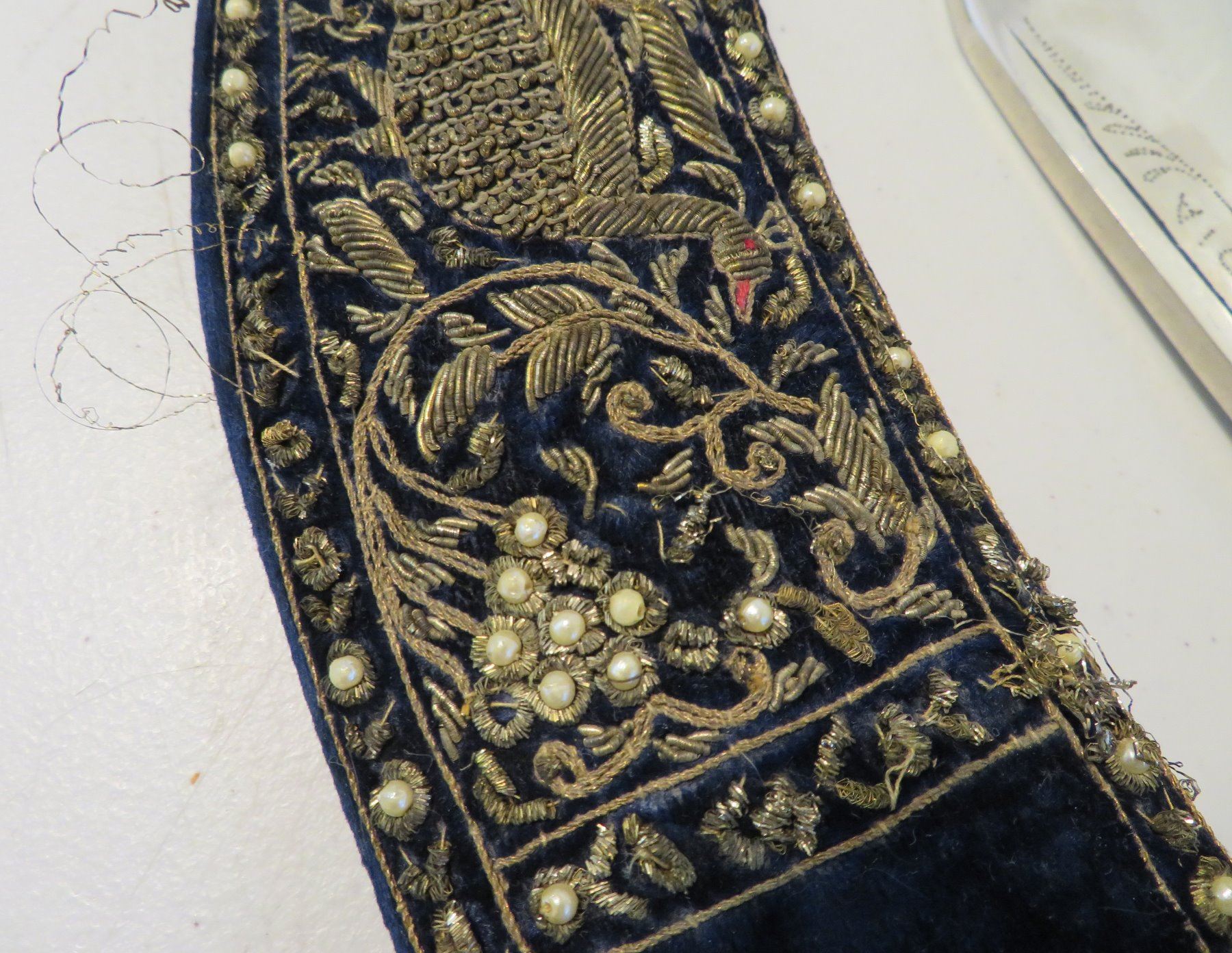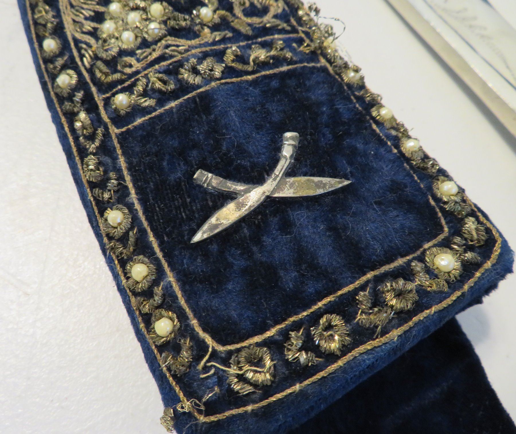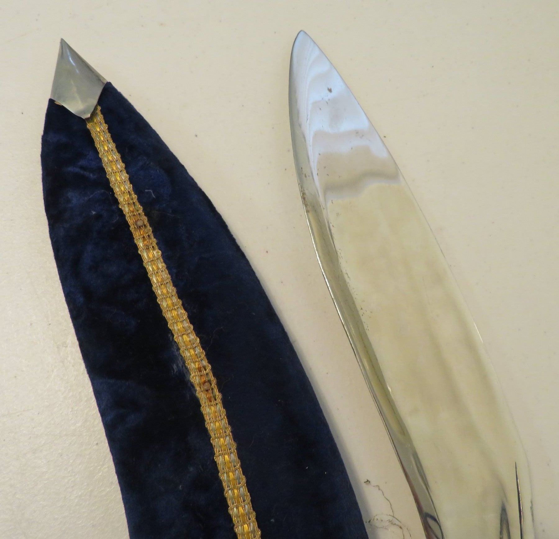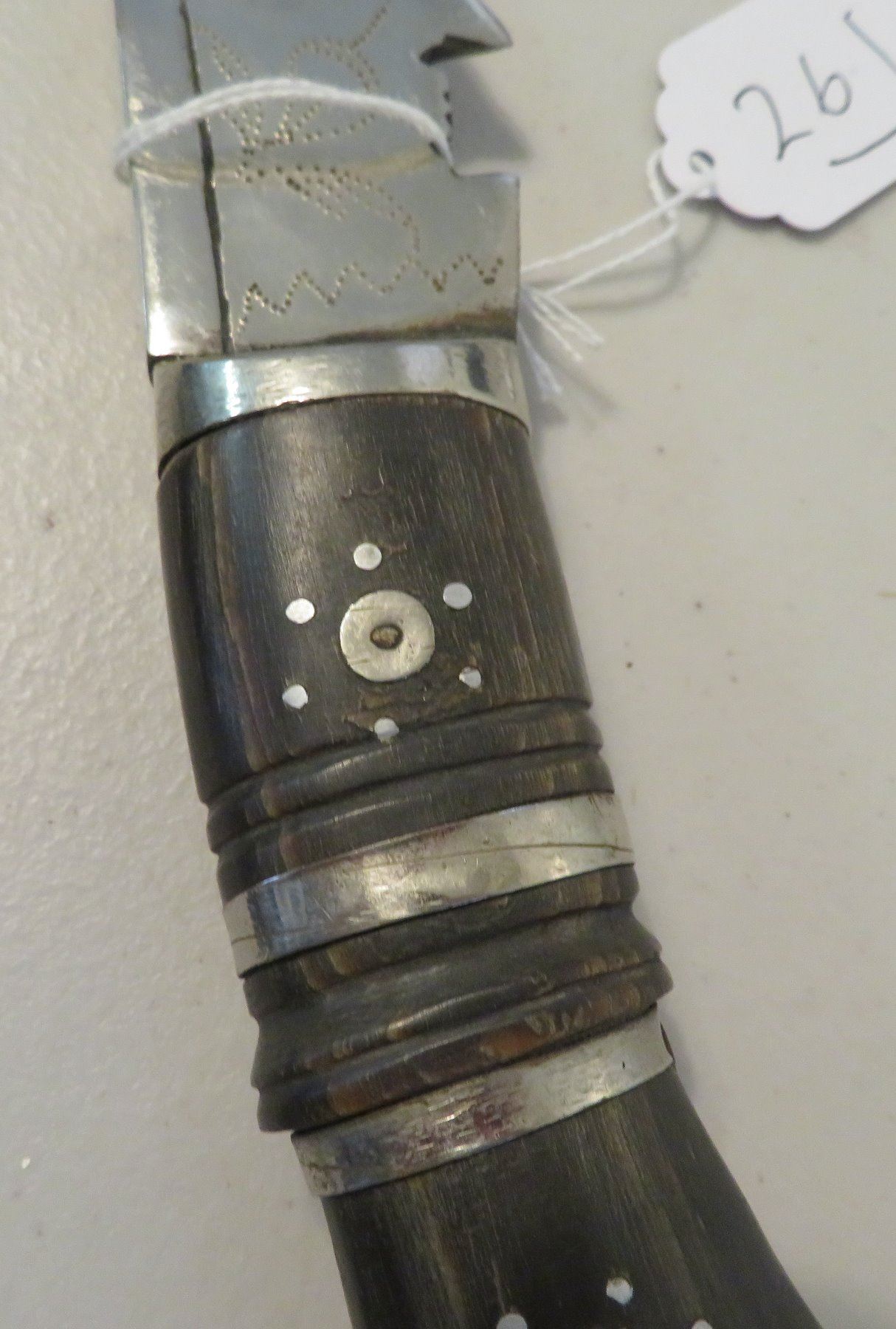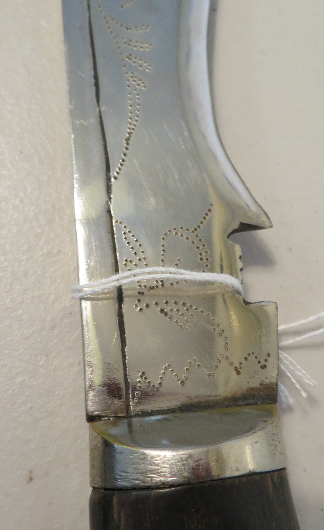 Antique Kukri Knife w/Silver Threaded Sheath, c. 100 years old, the item is made of horn, steel, metal, cloth, wood, silver thread and possibly pearls, the item measures 21" x 3 1/2" x 2" overall, with a 15 1/2" blade. India. Fine engraving on one side of this large knife, includes "India" and other designs. Very fine, blue sheath with heavily embroidered with silver thread and small beads. Condition: Good, patina and some thread loss, see images.