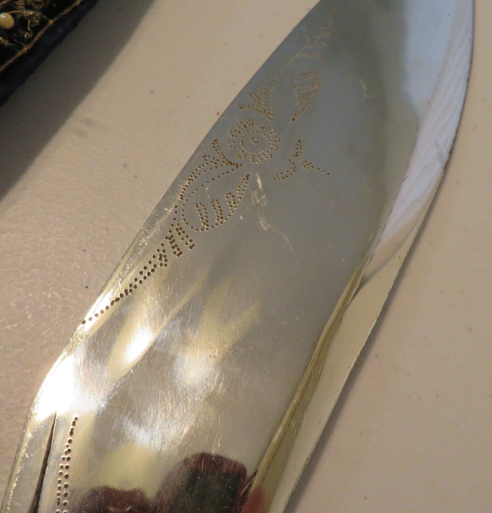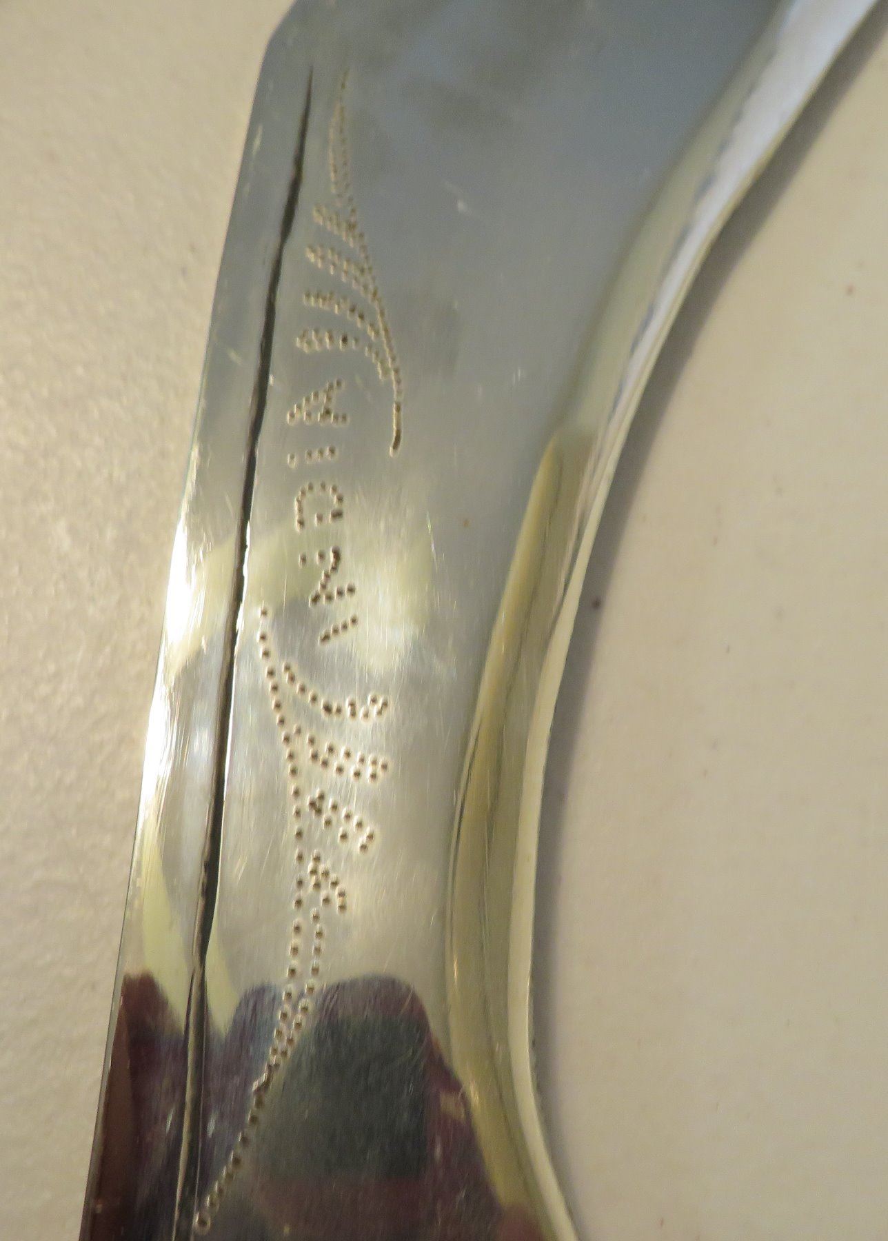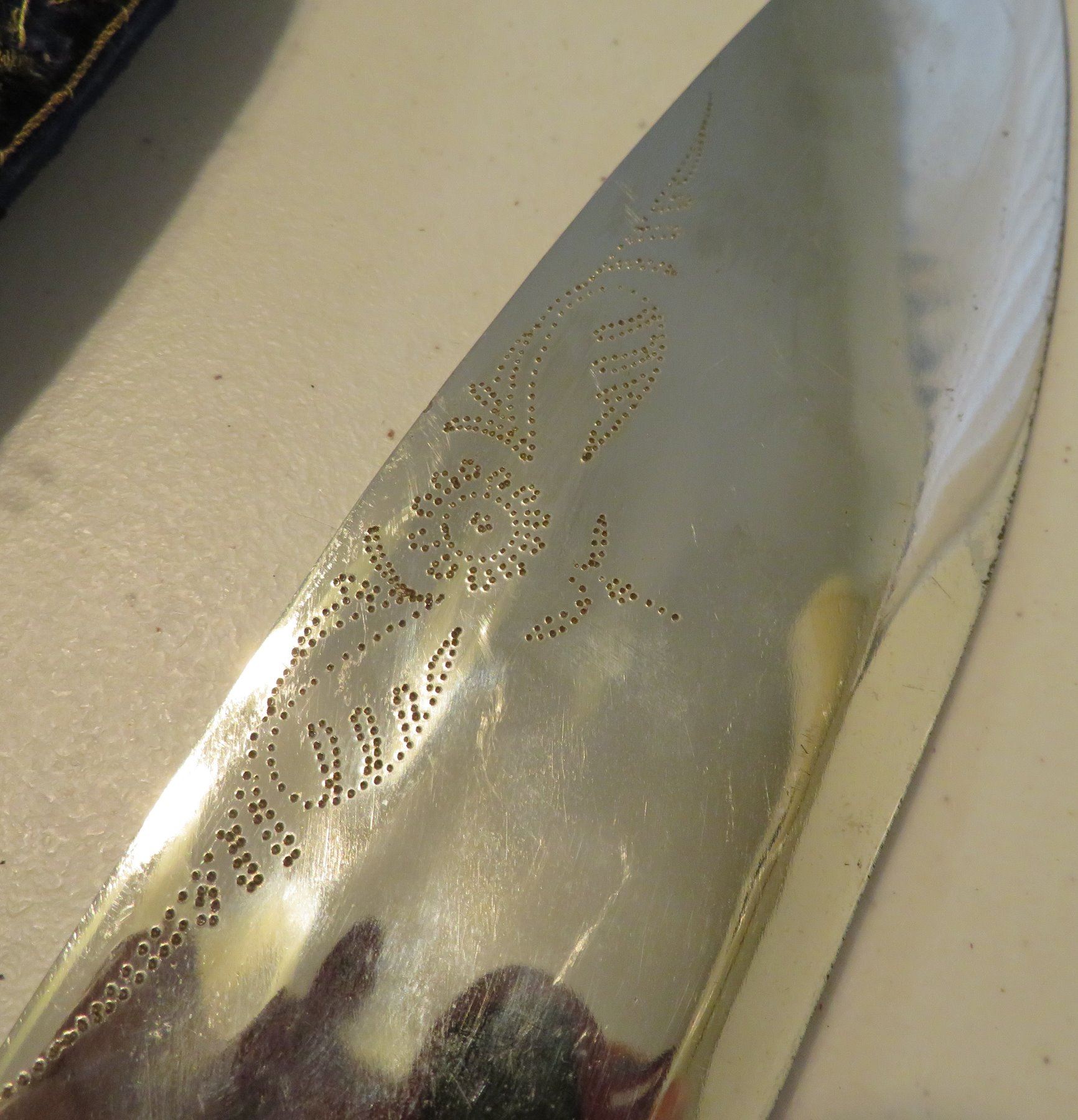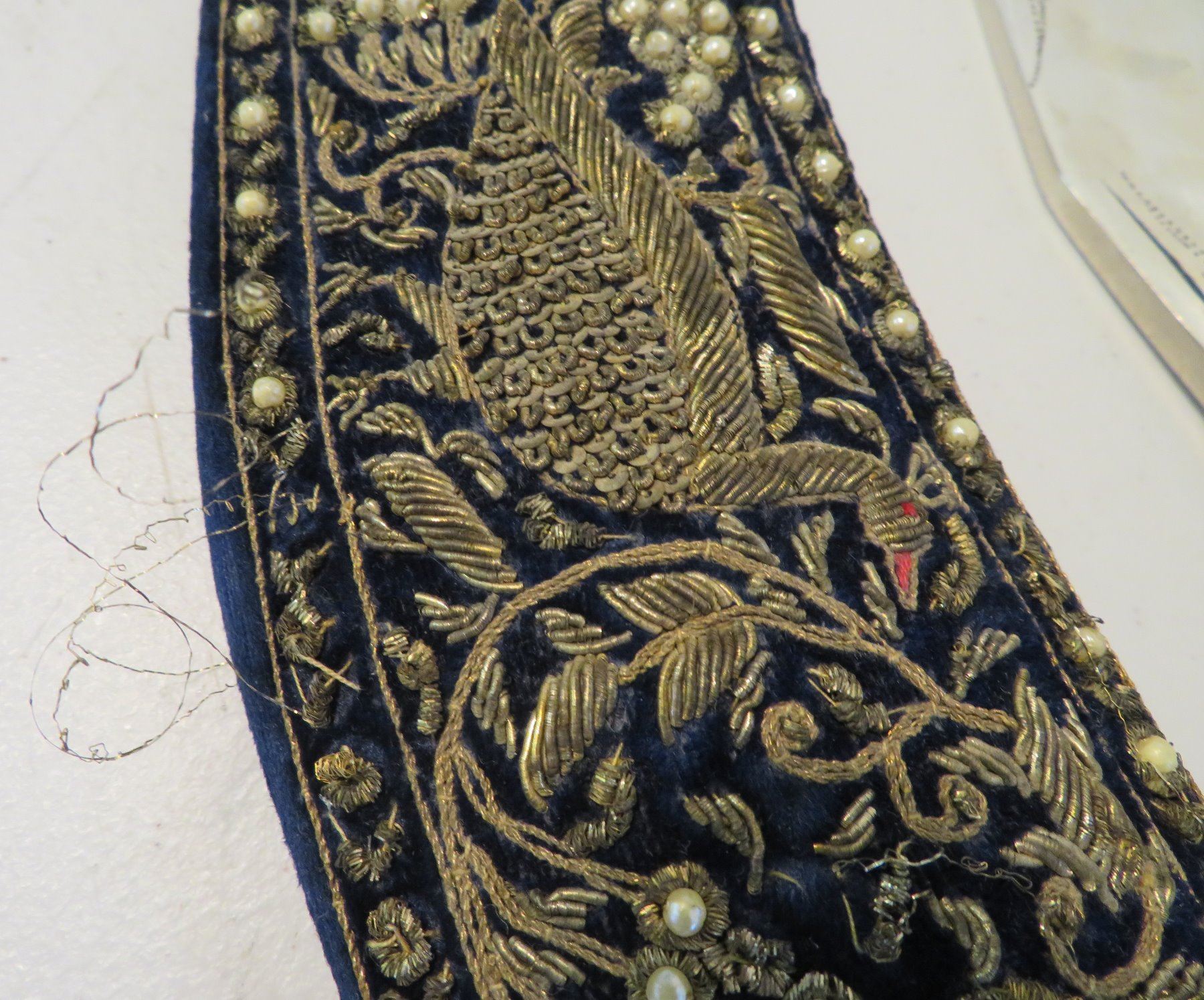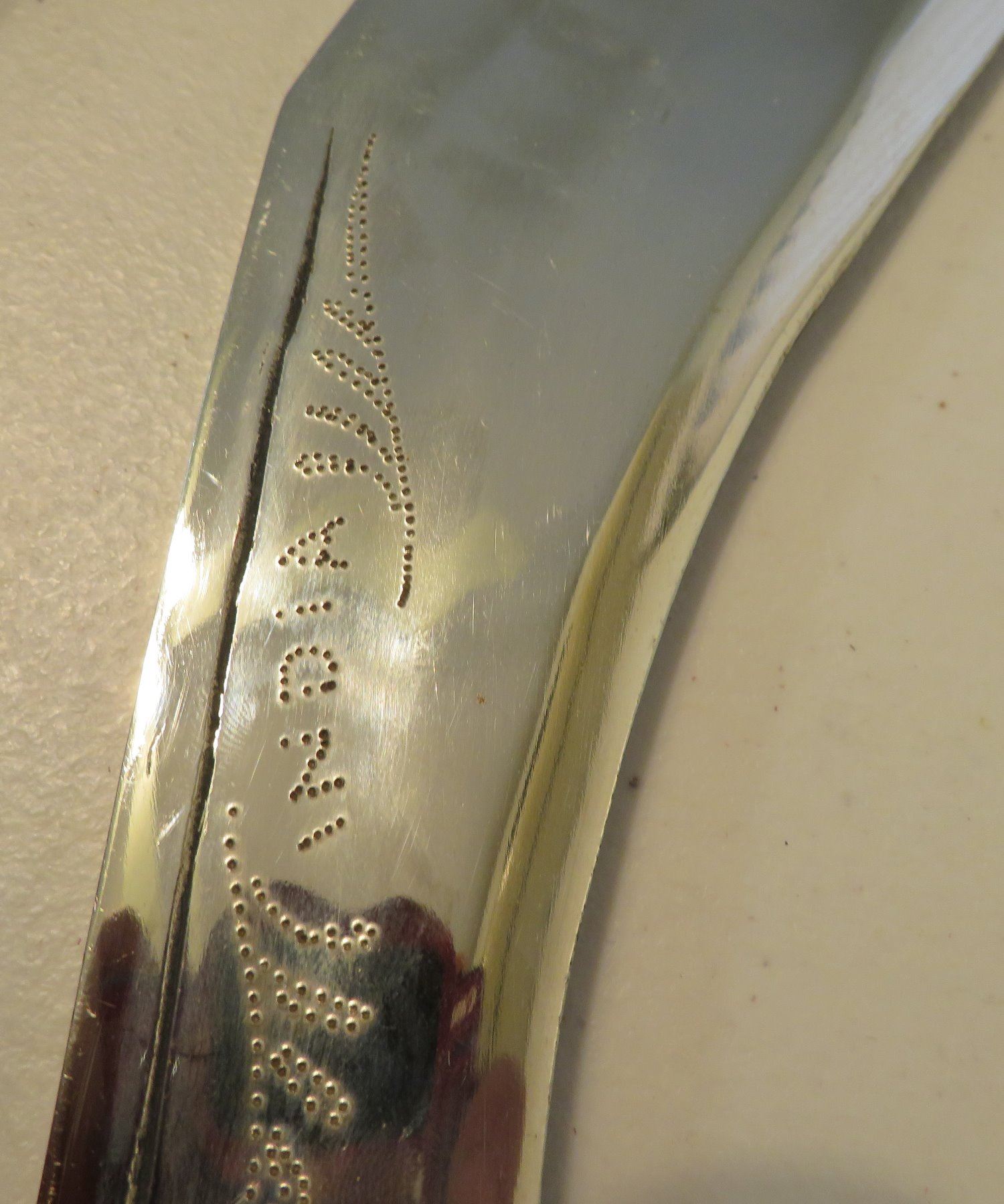 Antique Kukri Knife w/Silver Threaded Sheath, c. 100 years old, the item is made of horn, steel, metal, cloth, wood, silver thread and possibly pearls, the item measures 21" x 3 1/2" x 2" overall, with a 15 1/2" blade. India. Fine engraving on one side of this large knife, includes "India" and other designs. Very fine, blue sheath with heavily embroidered with silver thread and small beads. Condition: Good, patina and some thread loss, see images.