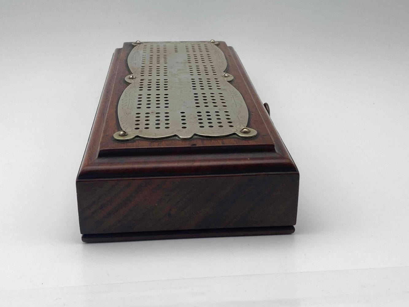 Antique Late 19th Century Walnut Cribbage Board, Decorated With Oak Leaves And Acorns. Includes 5 Game Pieces. Inscribed Mrs. John Gillis. Approximately 10.0L x 4.5W x 2.125H in.