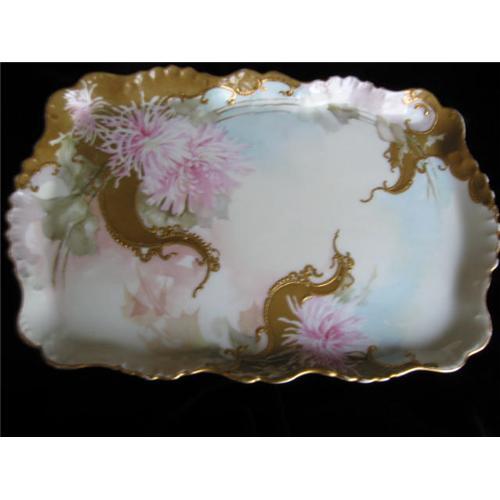 <table width="100%" border="0" cellspacing="0" cellpadding="4"><tr><td><em> SOOOO BEAUTIFUL!</em></td></tr><tr> <td width="100%"> Laviolettte Porcelain Limoges Vanity Tray. c:1896. Exquisite antique, hand painted, Laviolette, artist signed, Pink Dahlias porcelain French limoges vanity tray signed in gold on backside: Alice E. Liviergatore?, (I cannot make out the last name), 1896; and green Limoges, arrow symbol over France shown on pg. 351 of M. Gaston's book; mark for Laviolette c:1896-1905. This tray has no chips or cracks; just a bit of wear off the gold on the rim edge, nothing visually impairing. It is 12 inches long x 8 inches wide. Features pink dahlias and raised gold design. A breathtaking work of art! </td></tr><tr> <td> </td></tr><tr> <td>Reference #: limoges120513</td></tr><tr><td>Condition:good</td></tr><tr><td>Year:1896</td></tr><tr><td>Country:France</td></tr><tr><td>Height:8</td></tr><tr><td>Width:12</td></tr><tr><td>Title:Antique Laviolette Signed Porcelain Limoges</td></tr><tr><td>Type:Pink Dahlias</td></tr><tr><td>Location:rochester hills, michigan</td></tr></table>