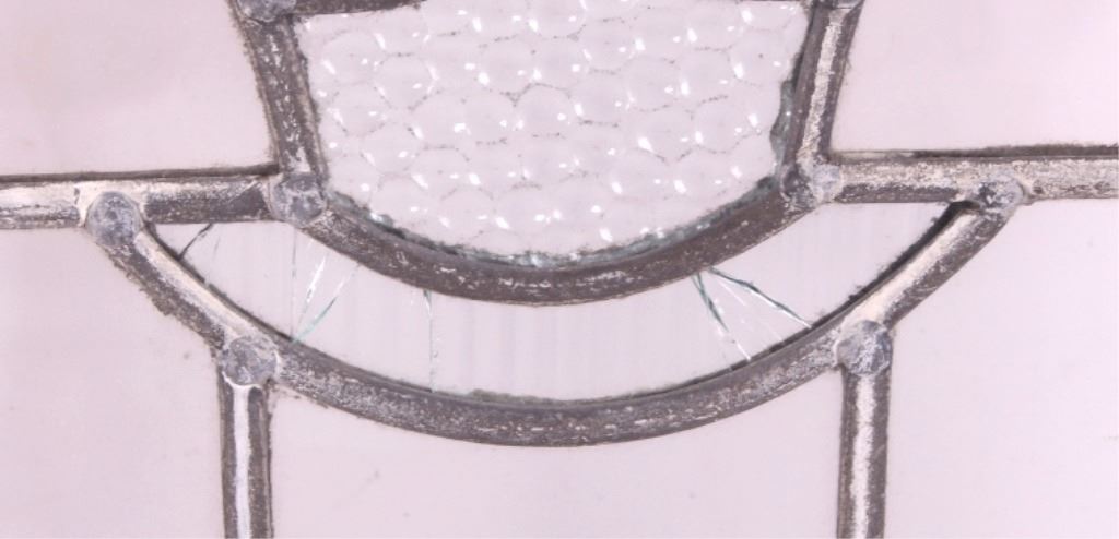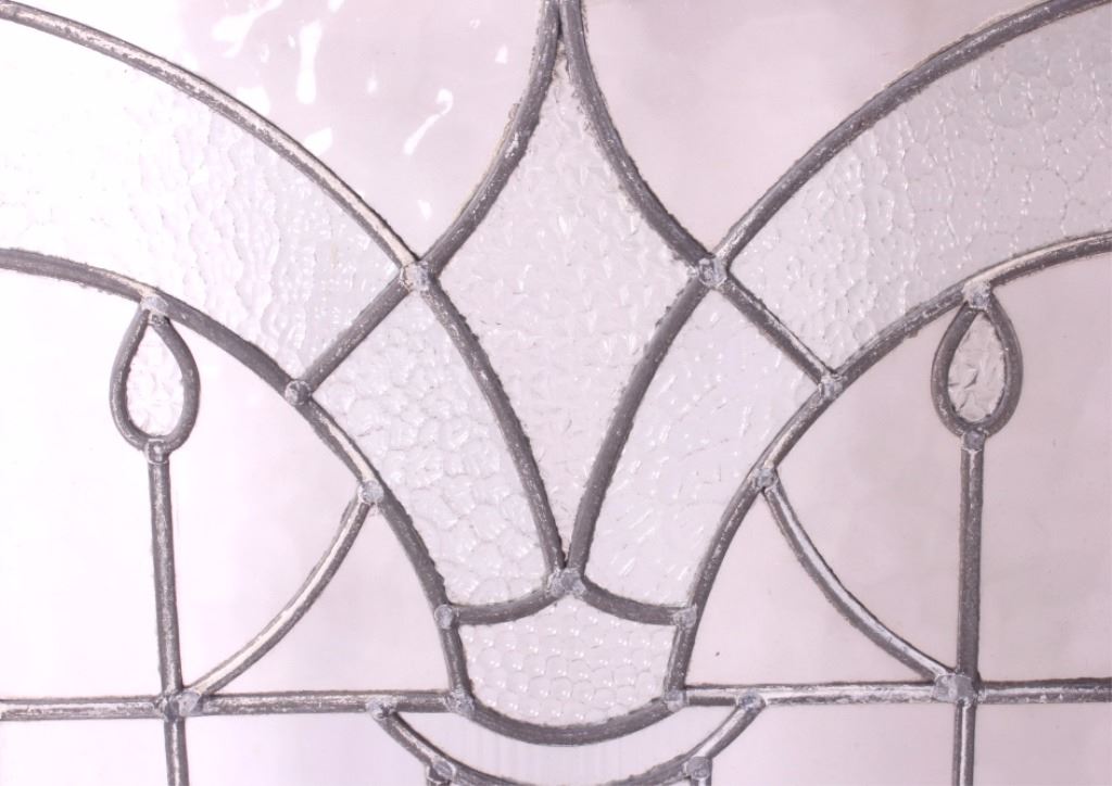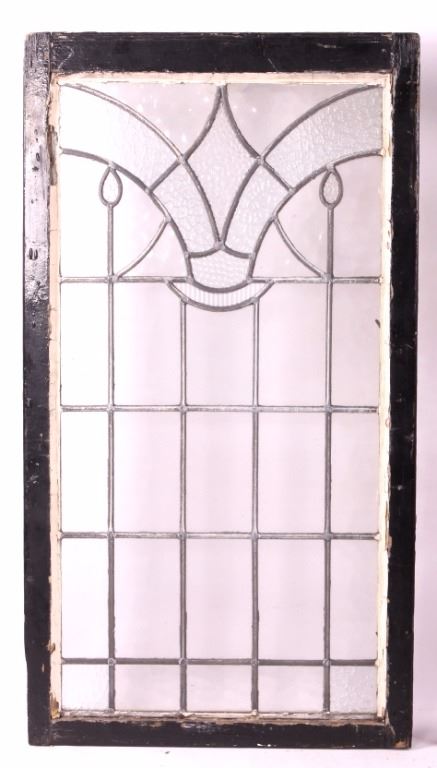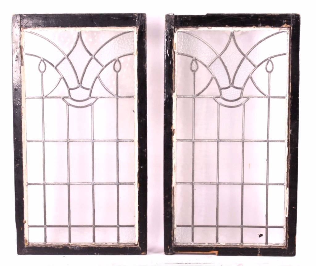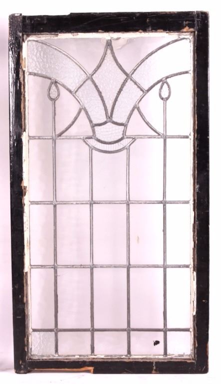 This is a pair of antique leaded glass windows. Each window features over 35 pieces of glass. Each piece has been precisely cut and joined together. The windows show a combination of textured and smooth glass. The antique leaded glass windows are in good overall condition. There are some cracked pieces as pictured. Each window measures 23.5" x 42.75".