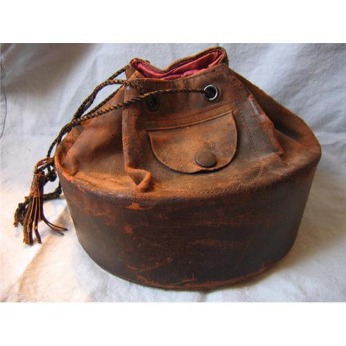 Unique round brown leather purse. The bottom portion is stiff; the top is soft so that the top can collapse to nestle down in the bottom. The lining is intact and a gorgeous raspberry silk. The top has a little pocket with a snap. The purse opens and closes by a tassled cord. The leather is worn, due to its age. The patina is lovely.