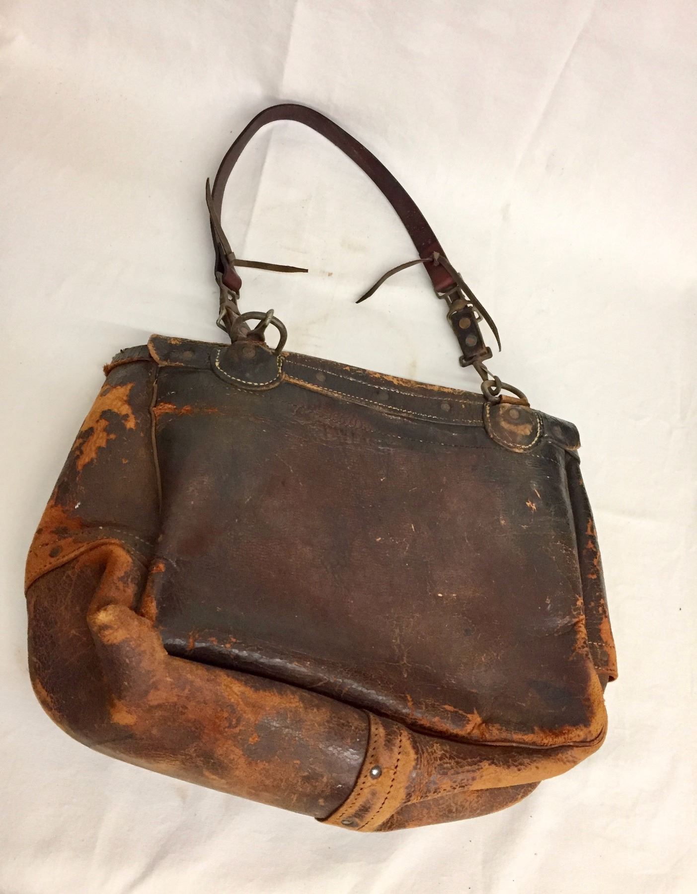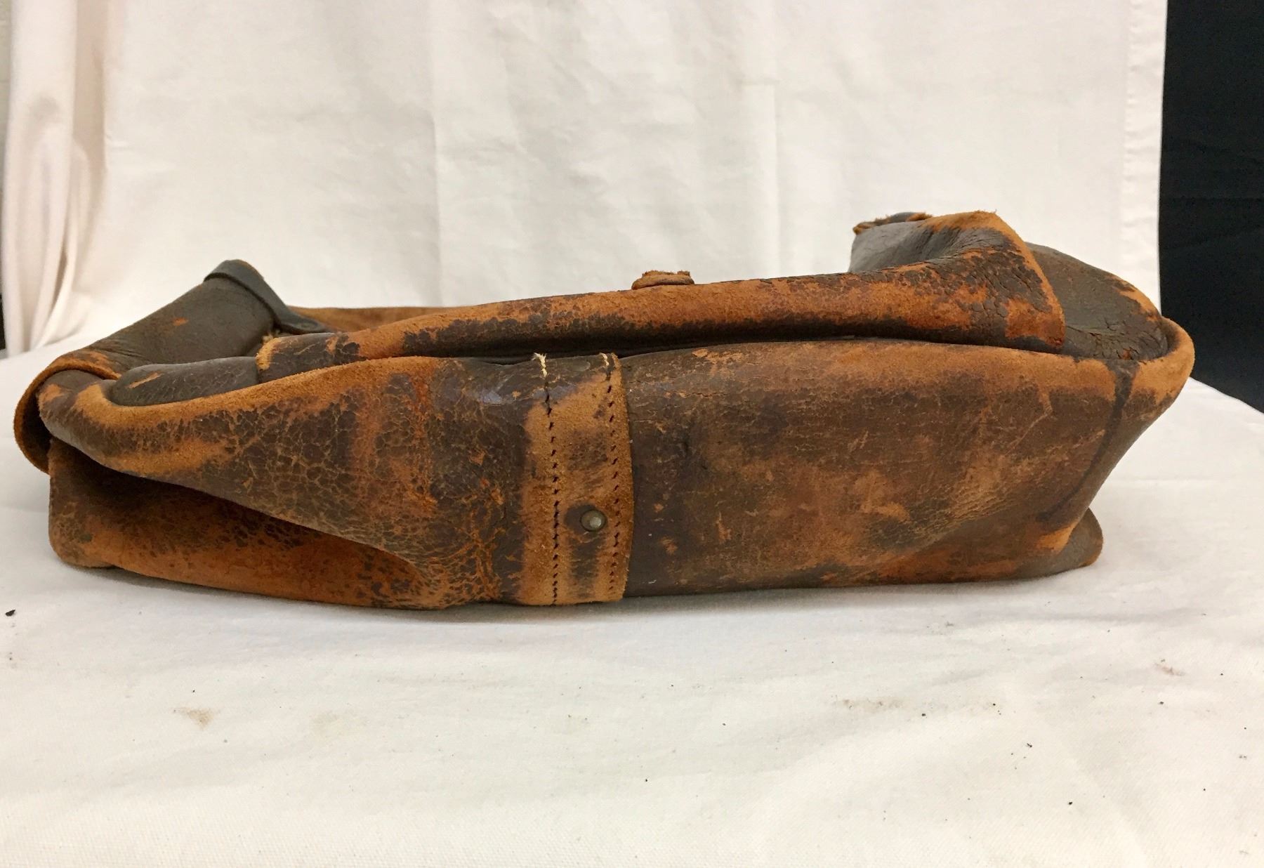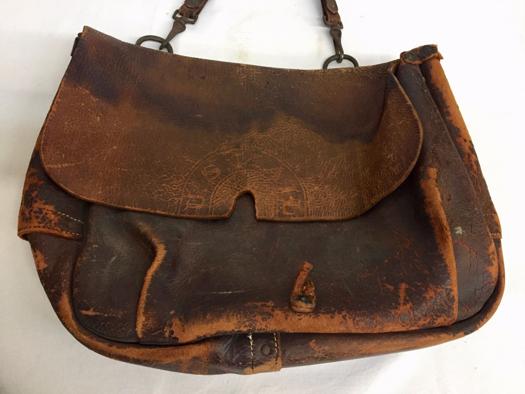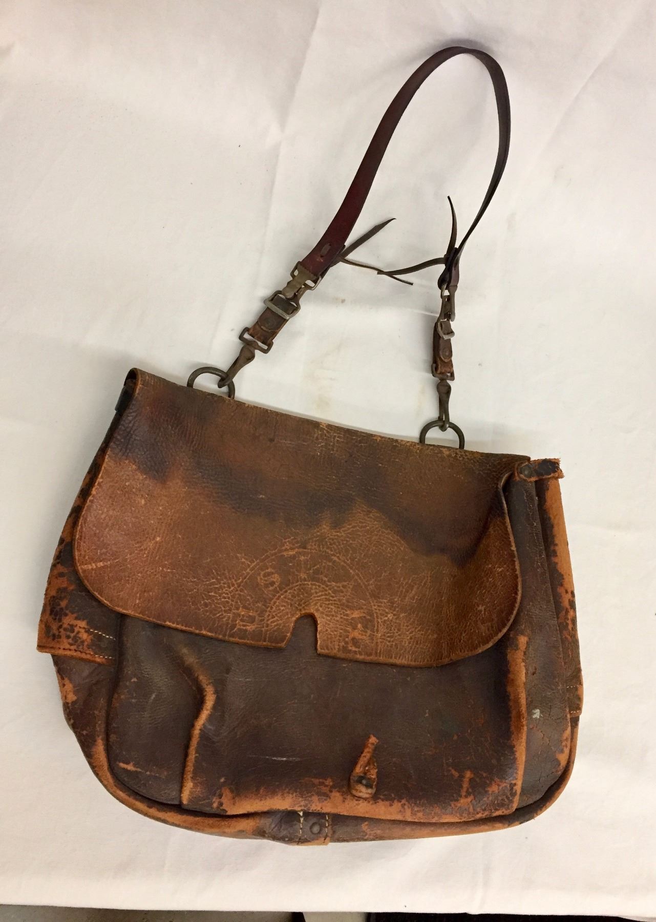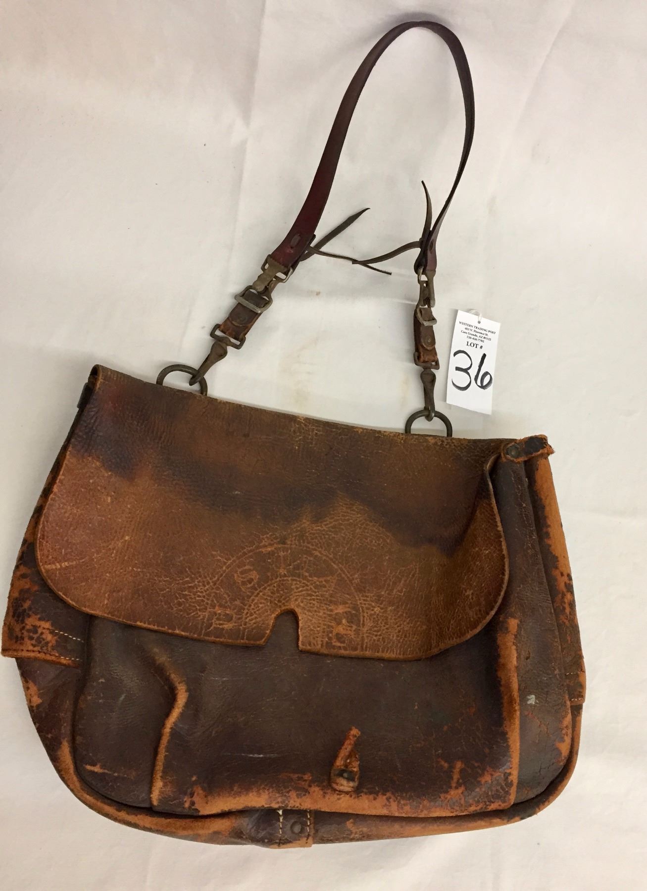 Description: An old, leather, US Mail carrying bag. Maker: Unmarked as far as we could tell. Approx. Age: Antique, circa early 1900s (strap is a more modern replacement). Size: Bag measures 15” l x 19” w. Strap is 15”. Condition: Fair for its age, wear expected. Please look closely at the pictures - they are an important part of our description. Shipping: There will be a $8 handling / packaging fee for shipping this lot. The actual cost of postage will be added on top of that.