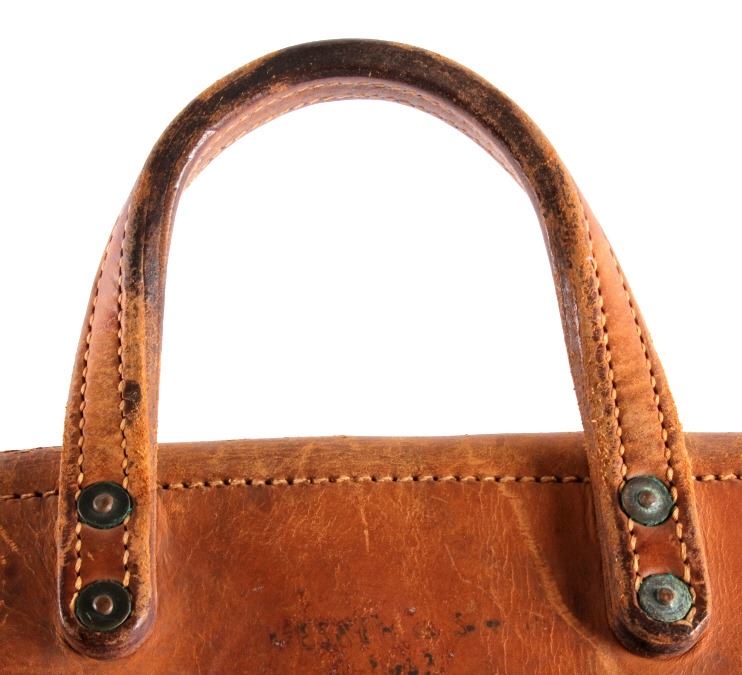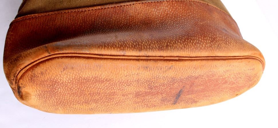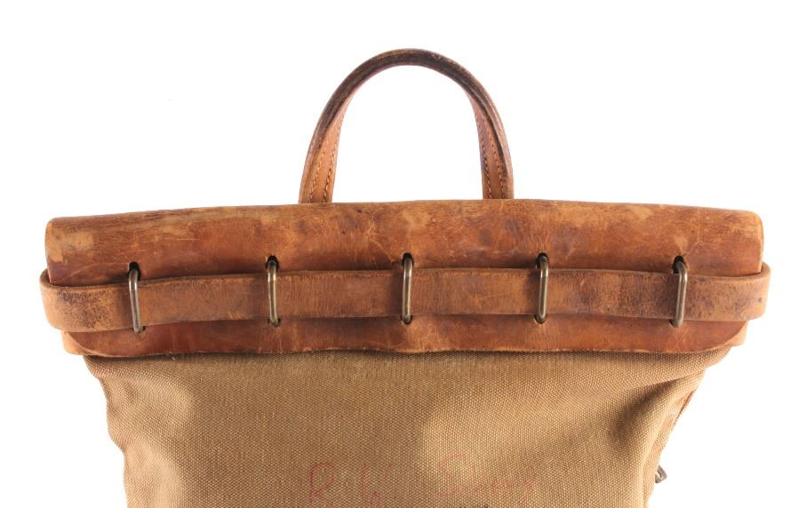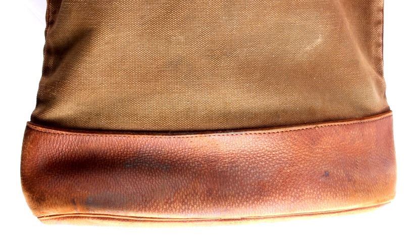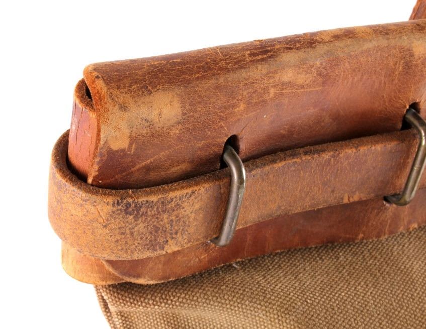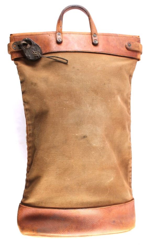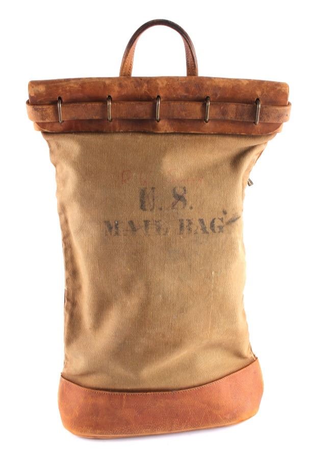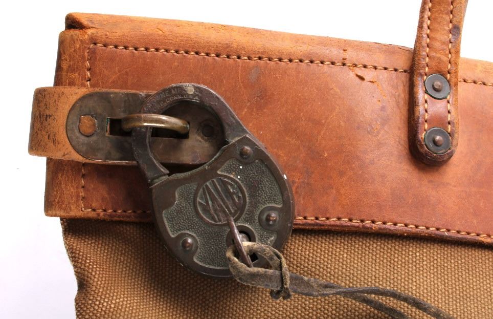 This is an antique leather and canvas U.S. mail bag with lock & key. The piece is marked "U.S. Mail Bag" and features a Yale brass lock with working key. The mail bag is in good condition. It measures 15" x 28".