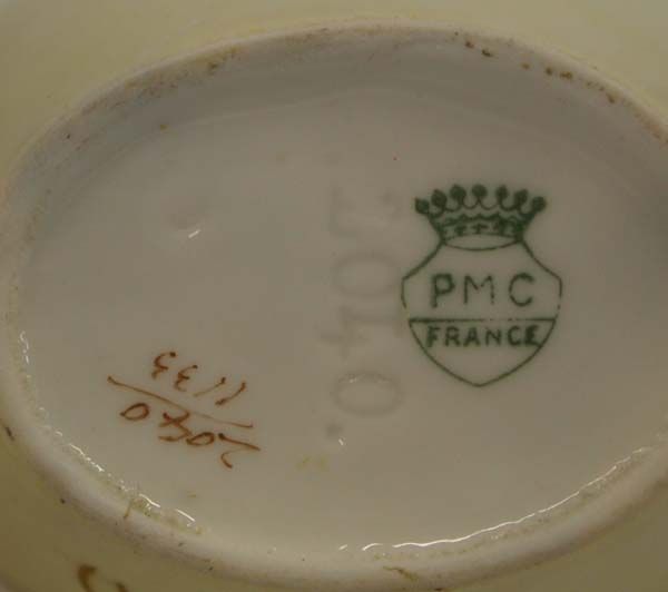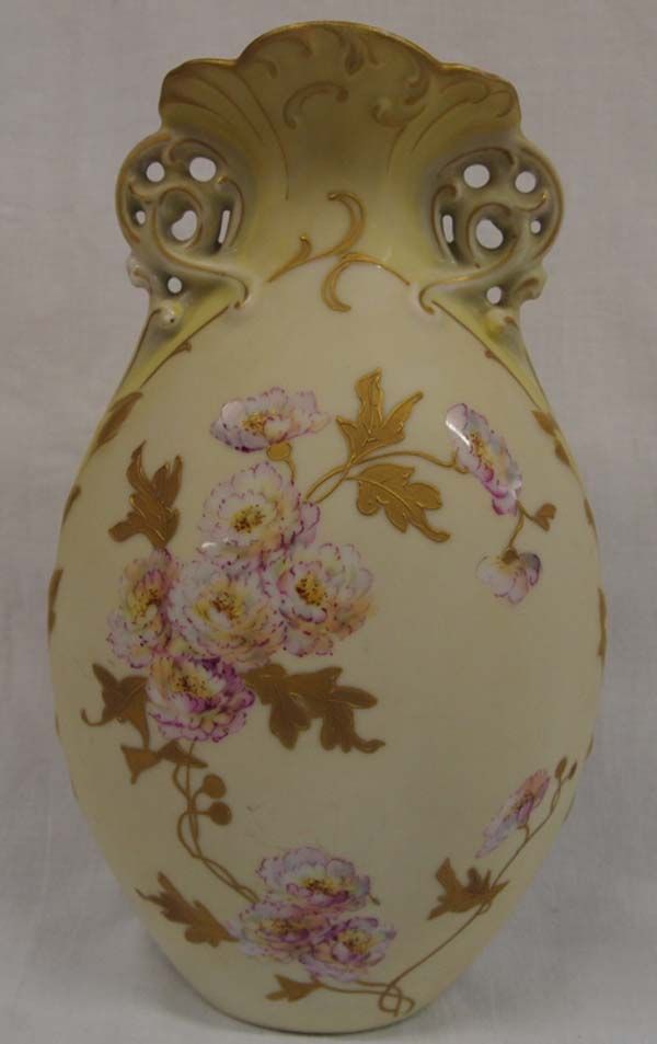 Antique Limoges Vase. Satin finished pale yellow ground with gold gilding surrounding lilac and pink flowers. Measures 10.5'' x 6.5'', marked ''PMC'' ''France''.