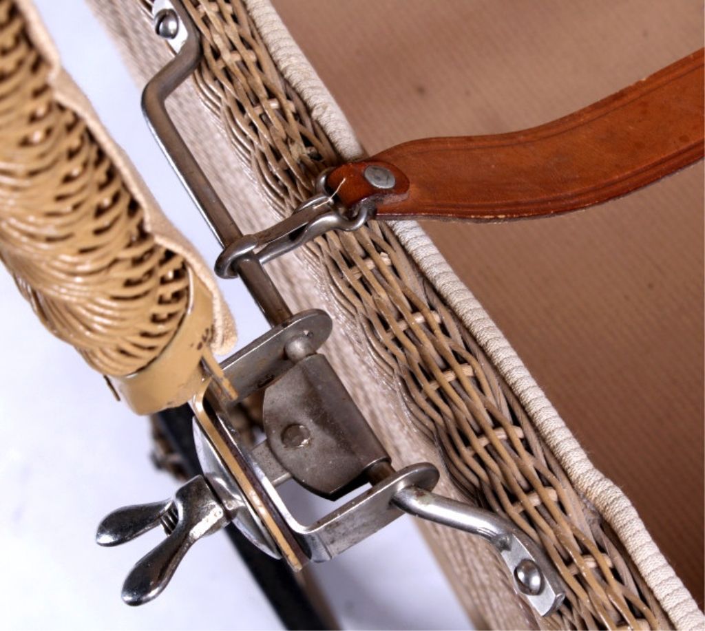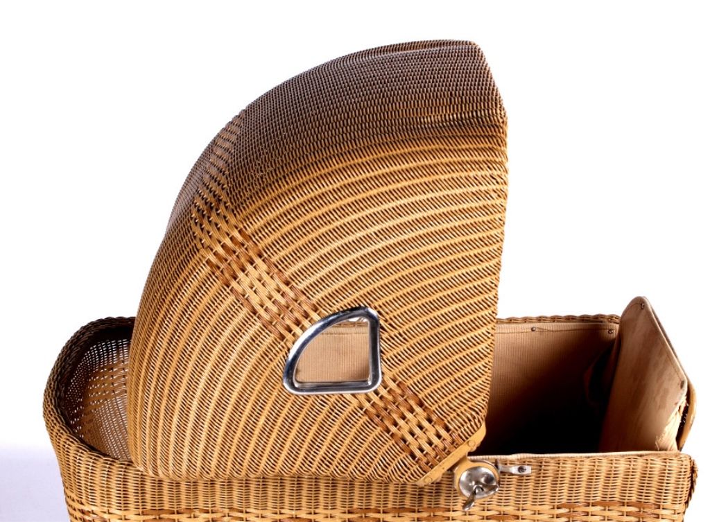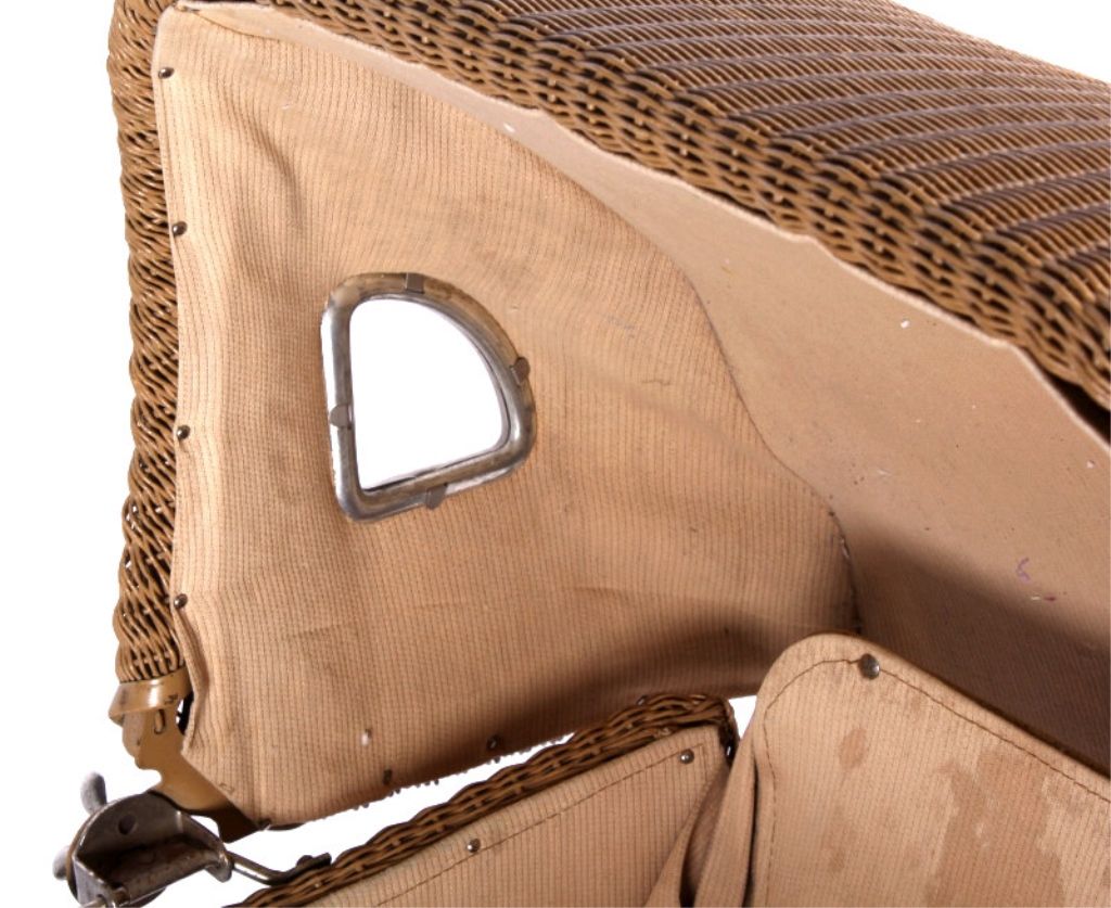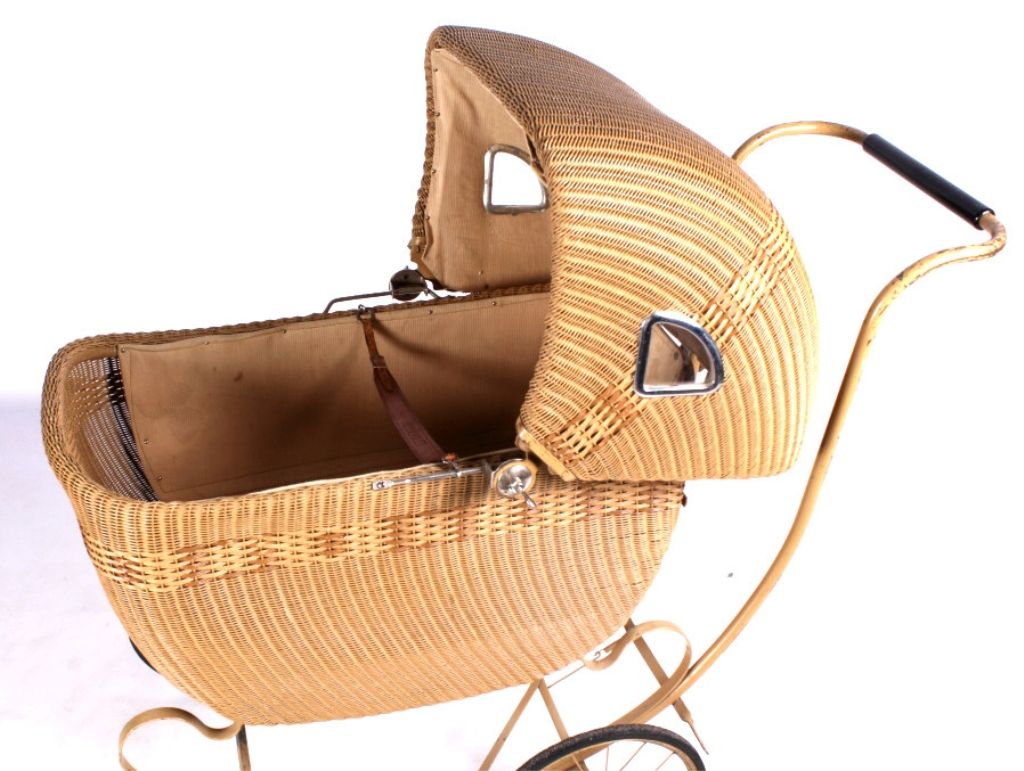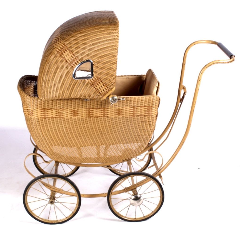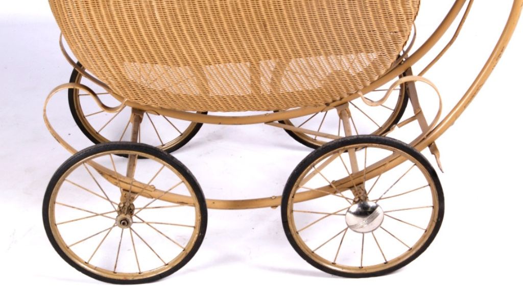 This lot features an antique Lloyd baby carriage. This carriage has wicker sides and top. It is upholstered with corduroy fabric. The baby carriage is in very good condition. It measures 22" x 44" and is 42" tall.