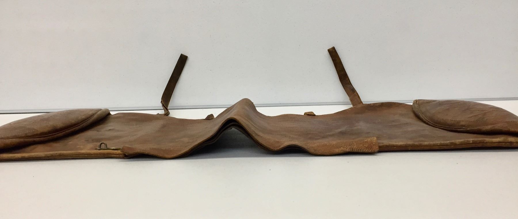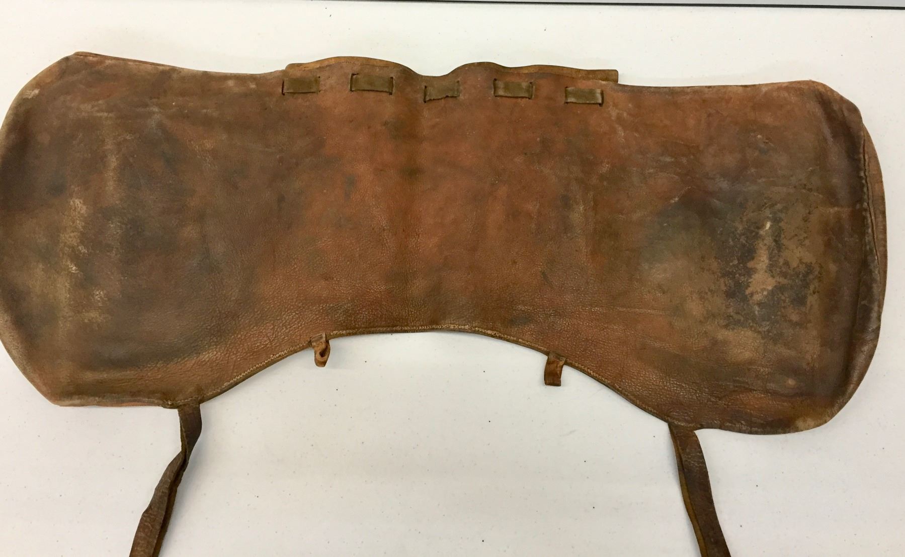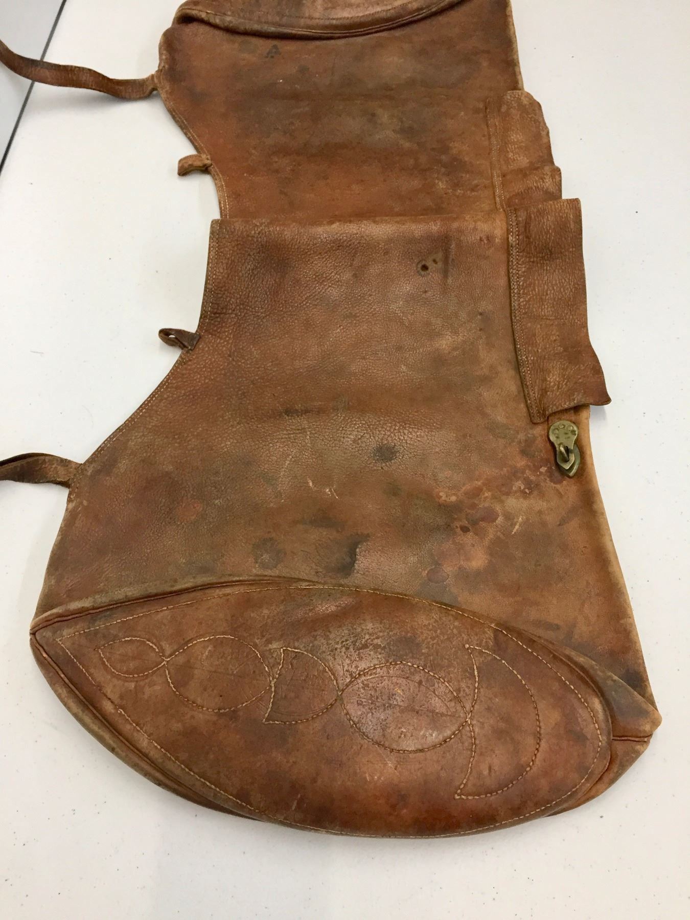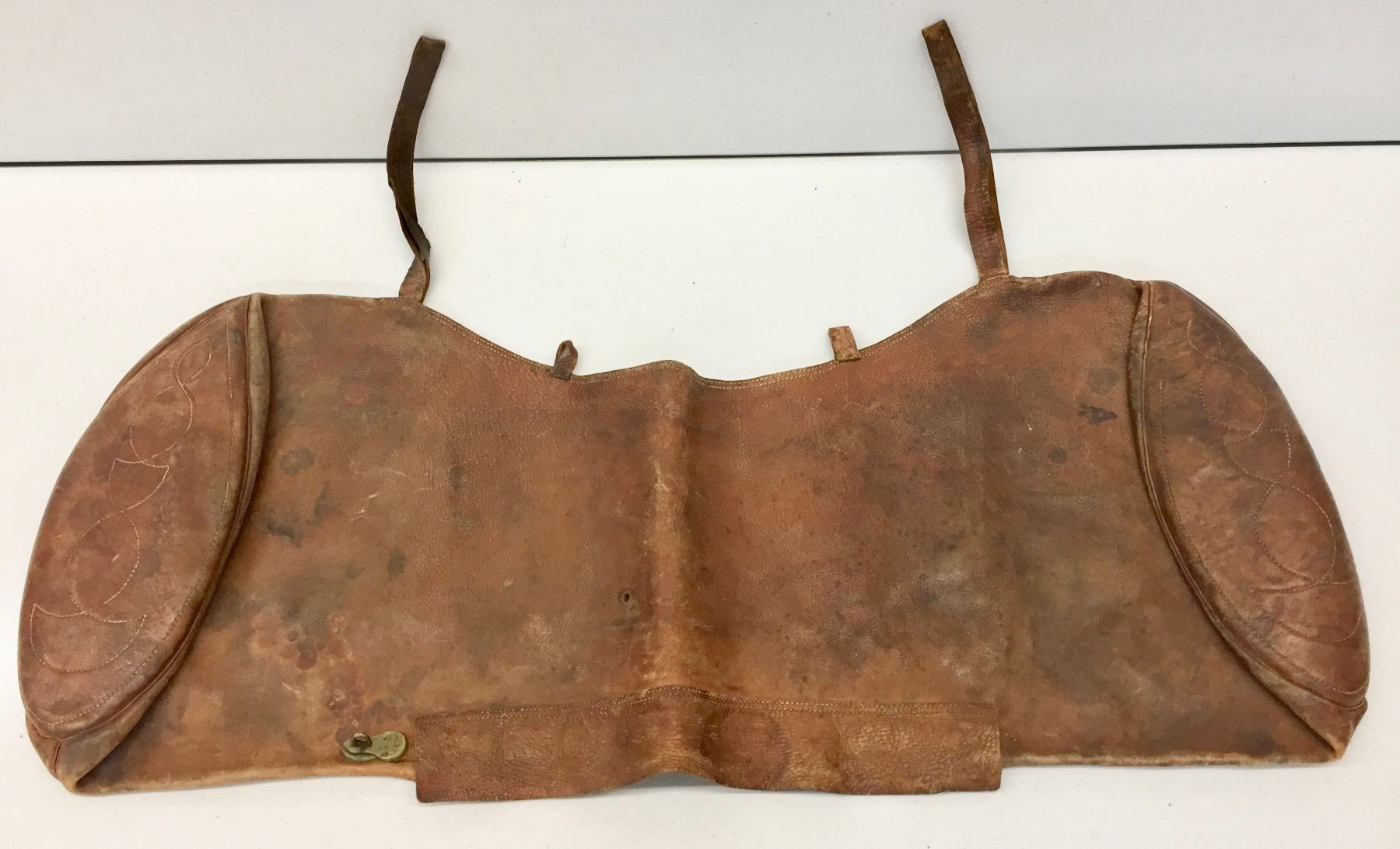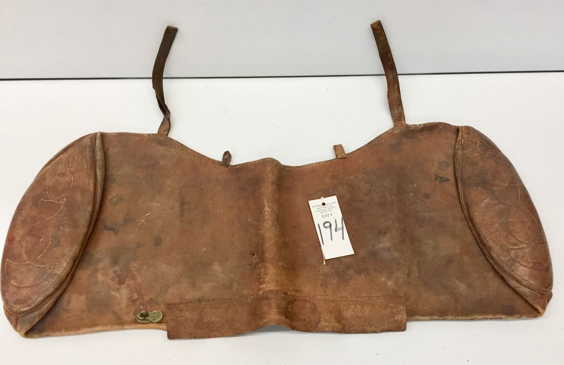 Description: Presented for sale in this lot is a unique pair of antique, lockable, leather saddlebags with hand stitched details. Great for hauling contraband! Maker: Unknown. Approx. Age: Early 1900s. Size: 35”w x 14-1/2” tall. Condition: Pretty good for their age, wear expected. Please look closely at the pictures - they are an important part of our description. Shipping: There will be a $7 handling / packaging fee for shipping this lot. The actual cost of postage will be added on top of that.