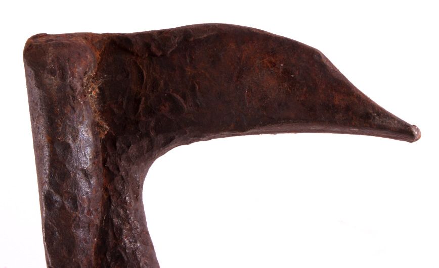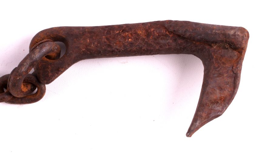 This is a set of logging dog hooks with chain. The dog hooks were hand forged. These were often used by loggers when floating logs down waterways. The dog hooks and chain are in good condition. Each hook is 6.5" long. The total length of the chain and hooks is 42.5" long.