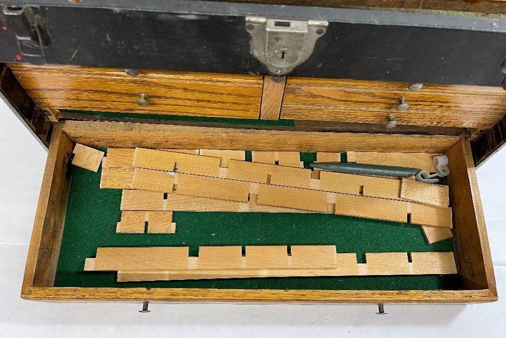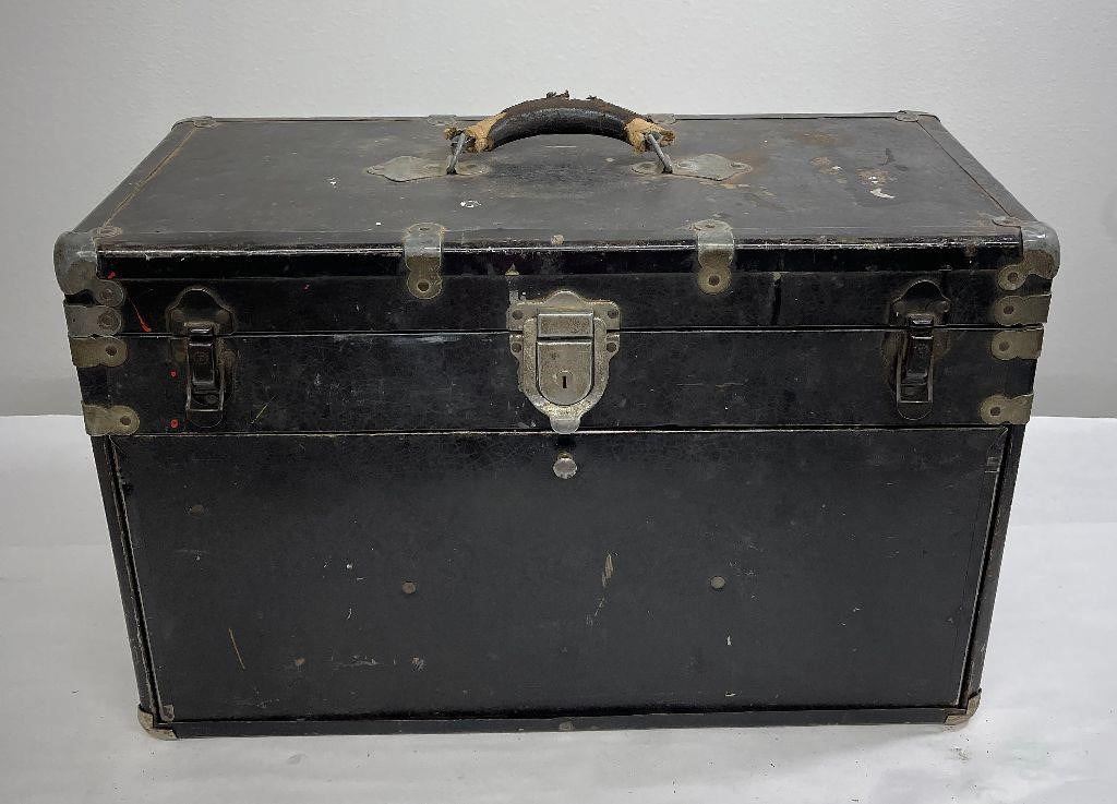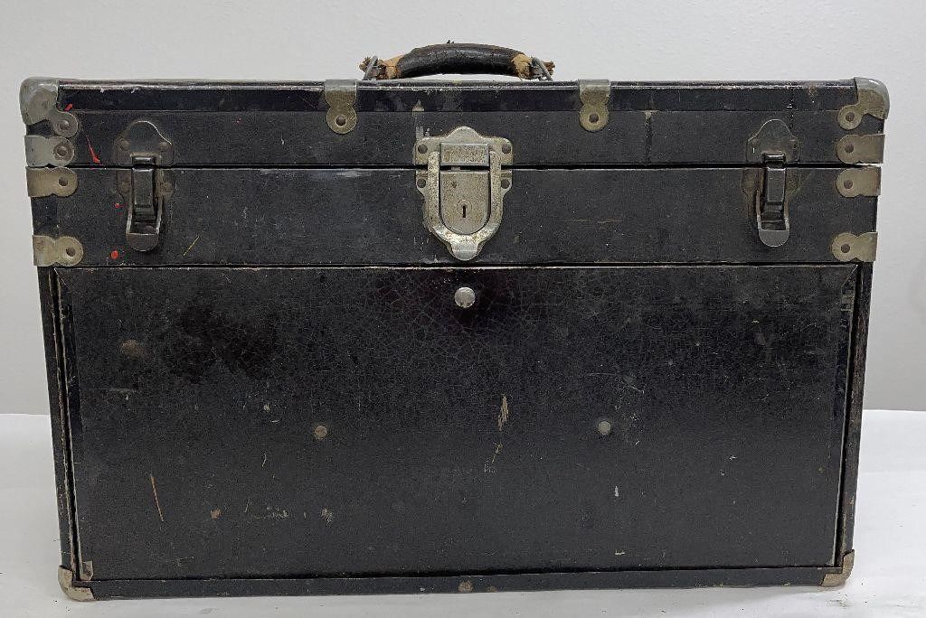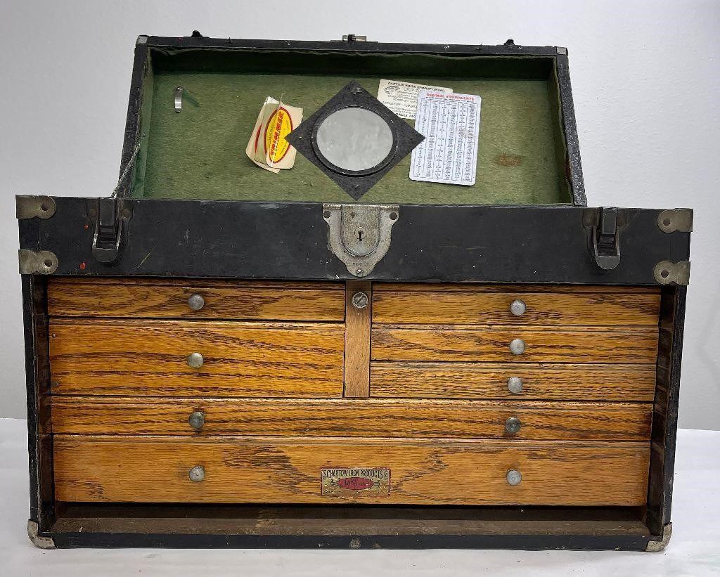 Nice old toolbox. Could use a cleaning, one drawer face needs to be re-glued but it is not broken or damaged. 20" long, 9" wide, 13" tall.