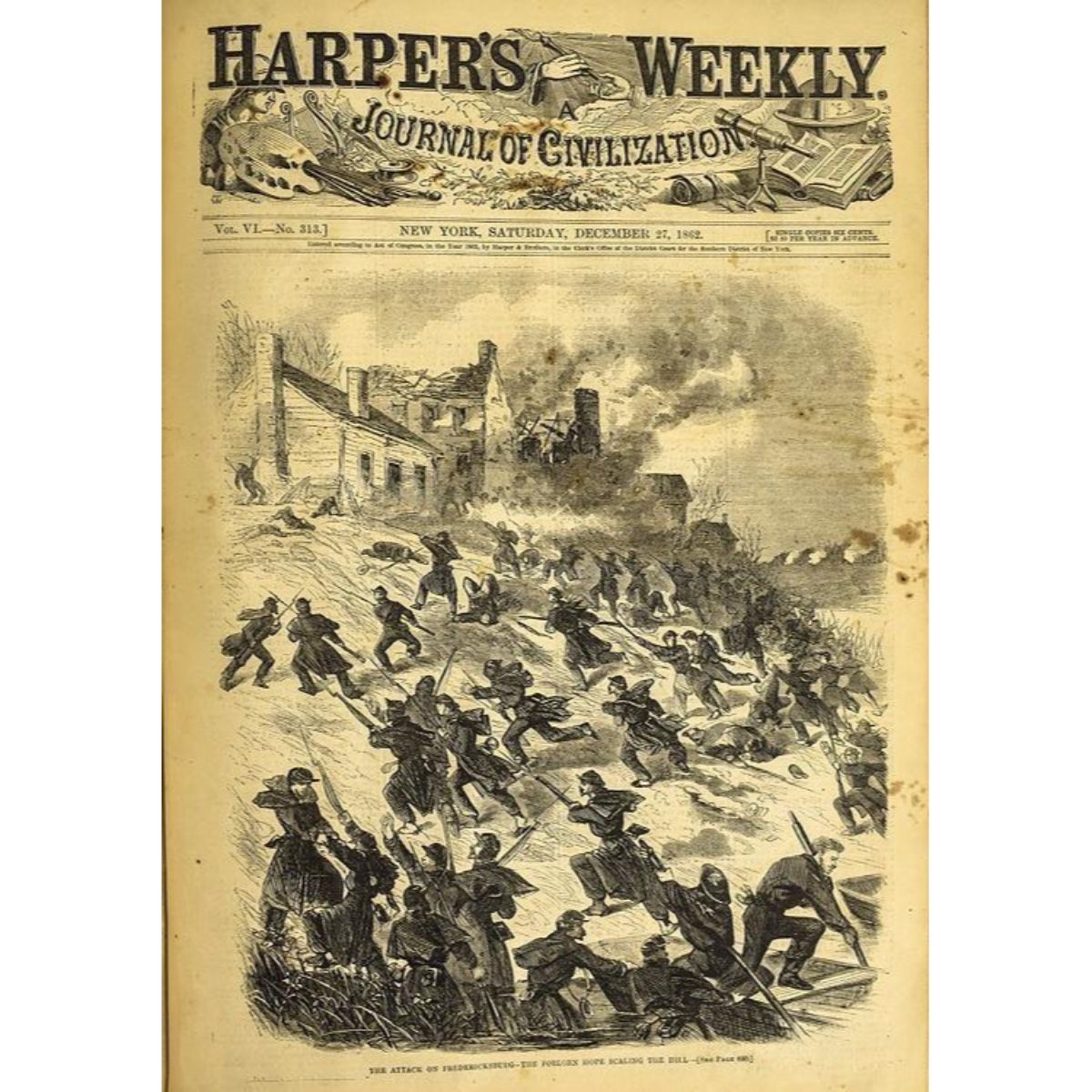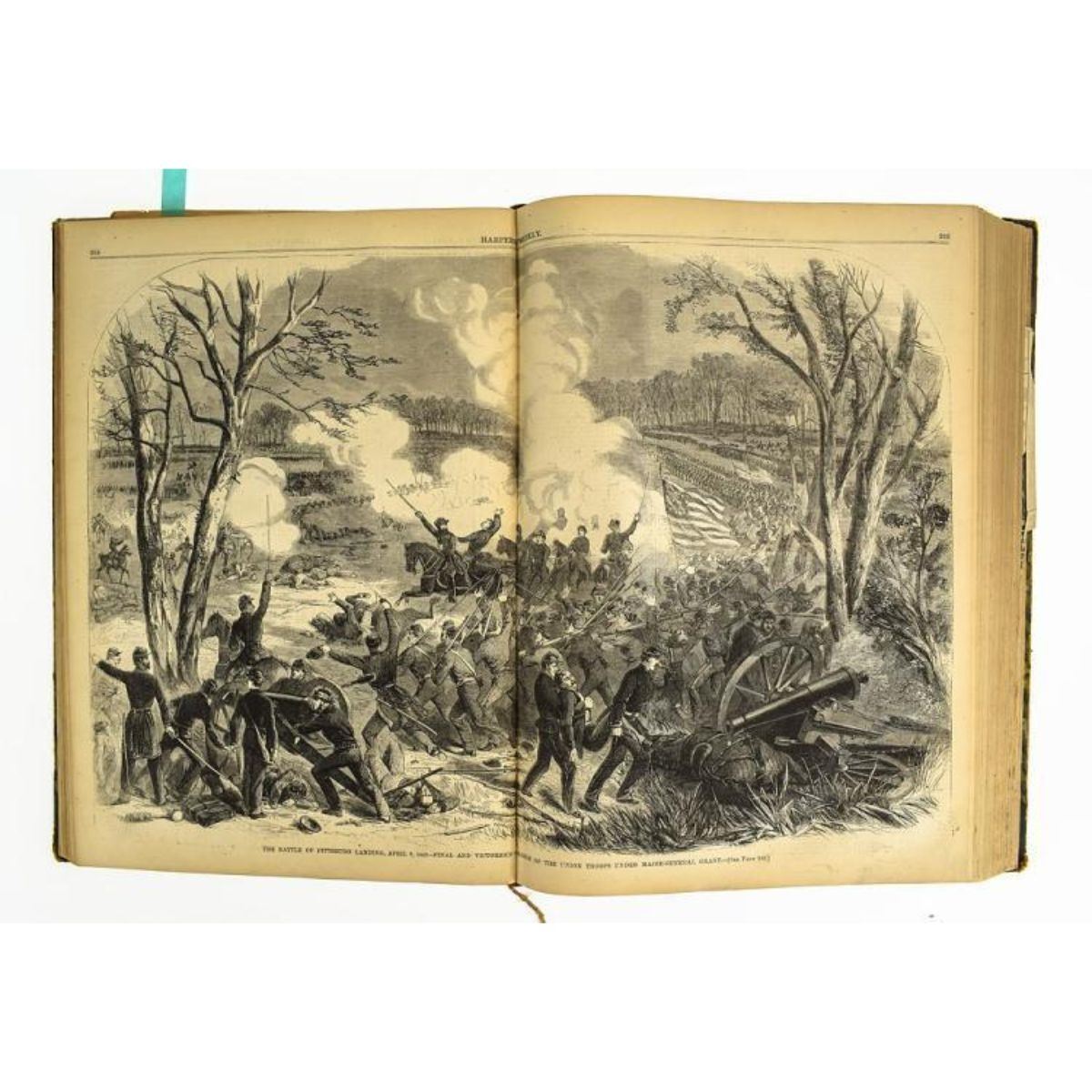 Item Overview Description: Title: Harper's Weekly: A Journal of Civilzation, 1862 Author: Uncredited Publisher: Harper & Brothers City: Unknown Year: 1863 Binding Style: Hardcover Pagination: 832 pages Width: 11.25" Height: 16" Book Details: This antique magazine compilation features Harper's Weekly from January 4 to December 27, 1862. The book is bound by decorative green marbled paper boards with dark leather bindings. The title and year are emblazoned in gilt letters on the leather spine cover. Encompassing a tumultuous year during the American Civil War, this collection of Harper's Weekly features numerous illustrations of battles and other important events including: the Battle of Pittsburg Landing; the Great Naval Battle before Memphis; the Battle of Baton Rouge; the Battle of Beever Creek; and more. Condition / Notes: The boards of this volume display moderate to significant rubbing and shelfwear, particularly on edges and high points. There are partial cracks to the front and back hinges though the binding is otherwise solid and intact. Several pages and illustrations have been clipped or lost, and at least one page is detached. Some typical age toning is visible on the pages though the text and illustrations remain clear and legible throughout the book. - 10425-050518-IN-02203