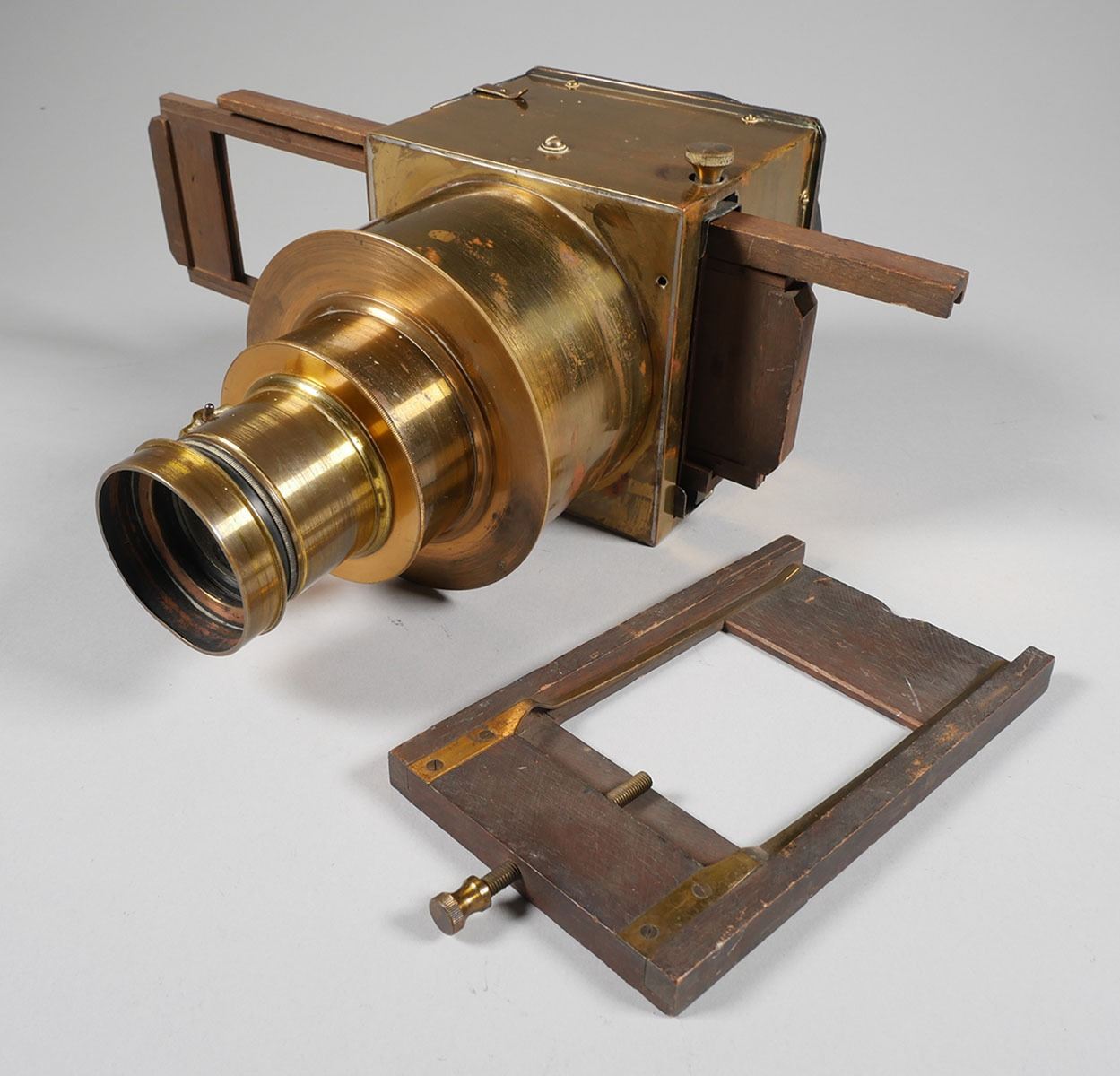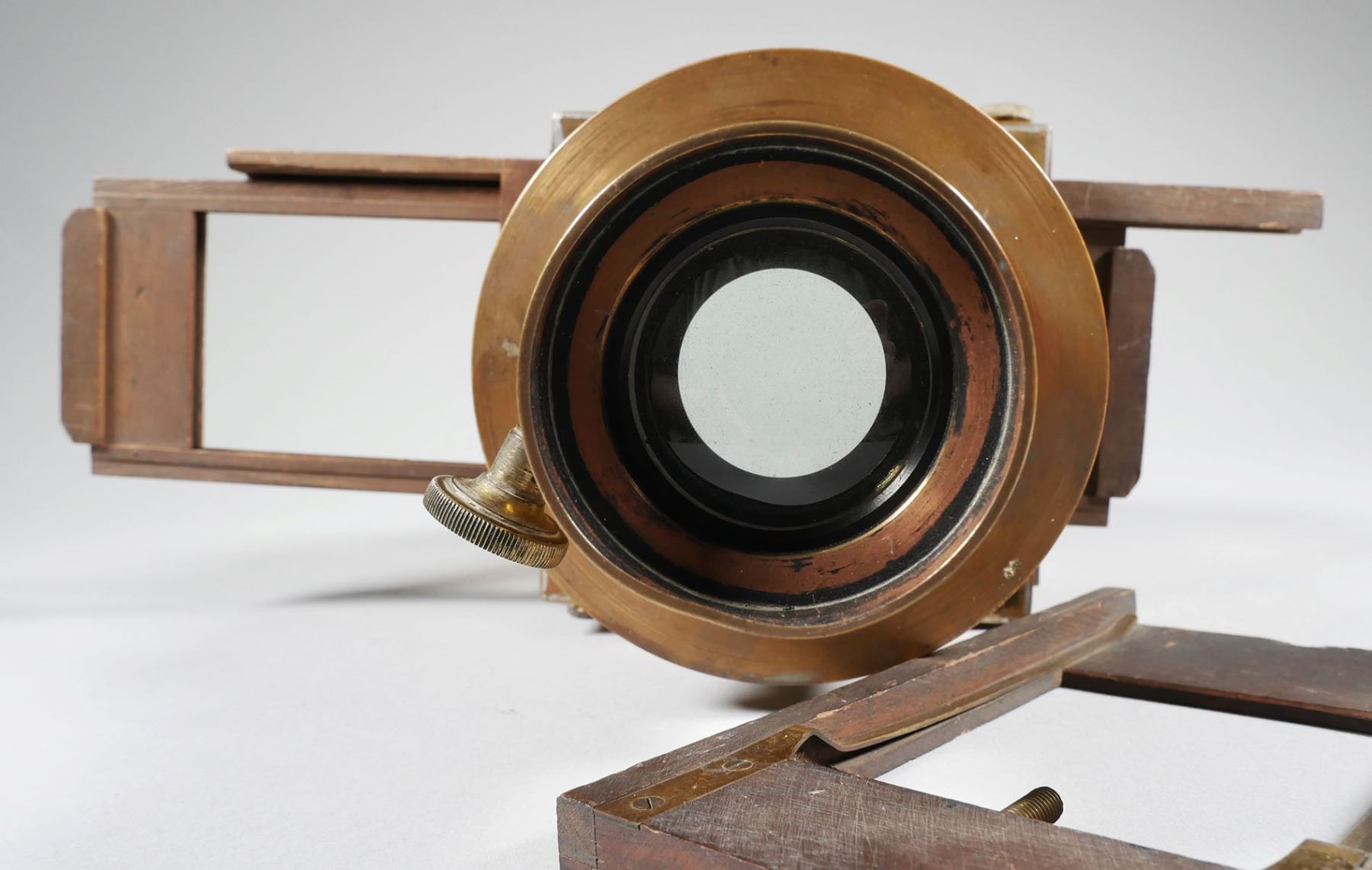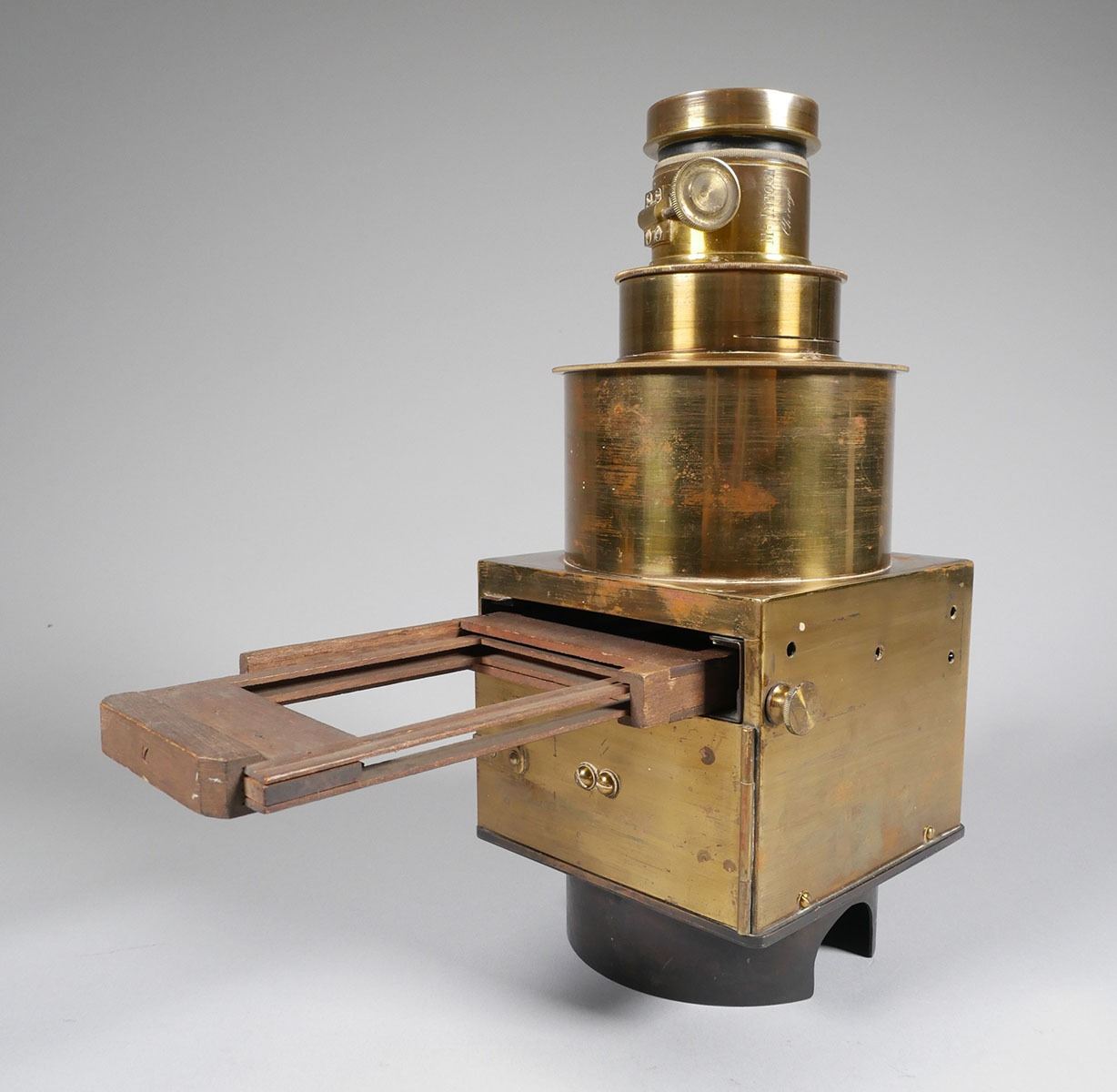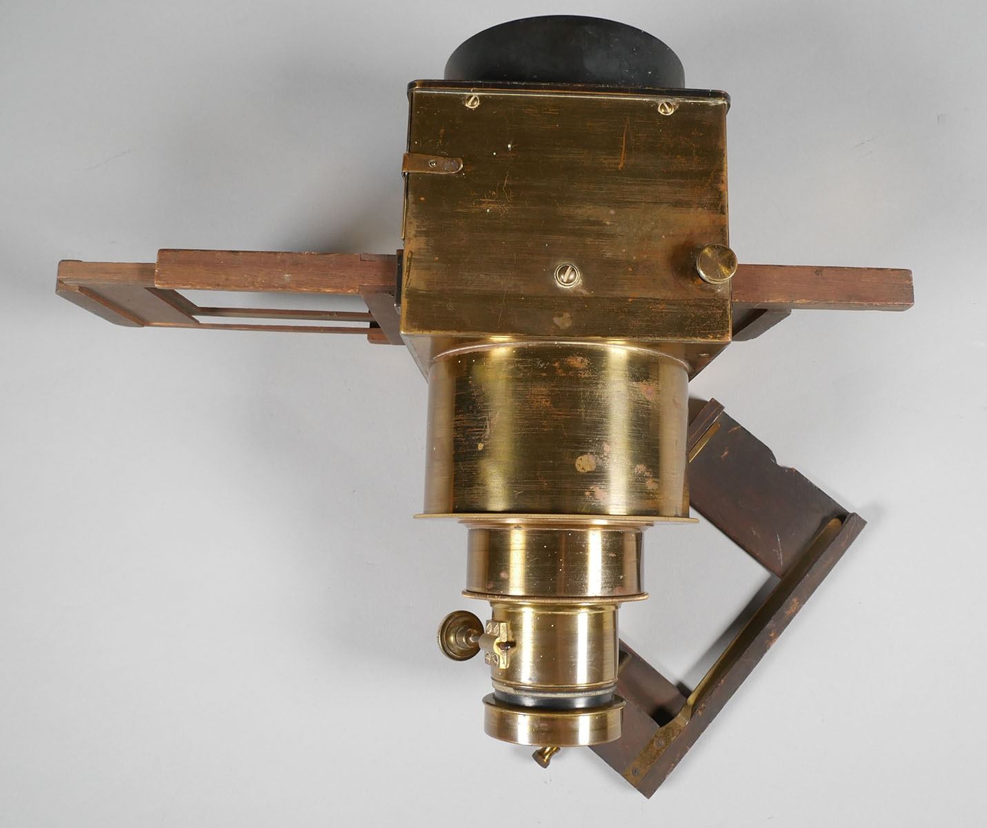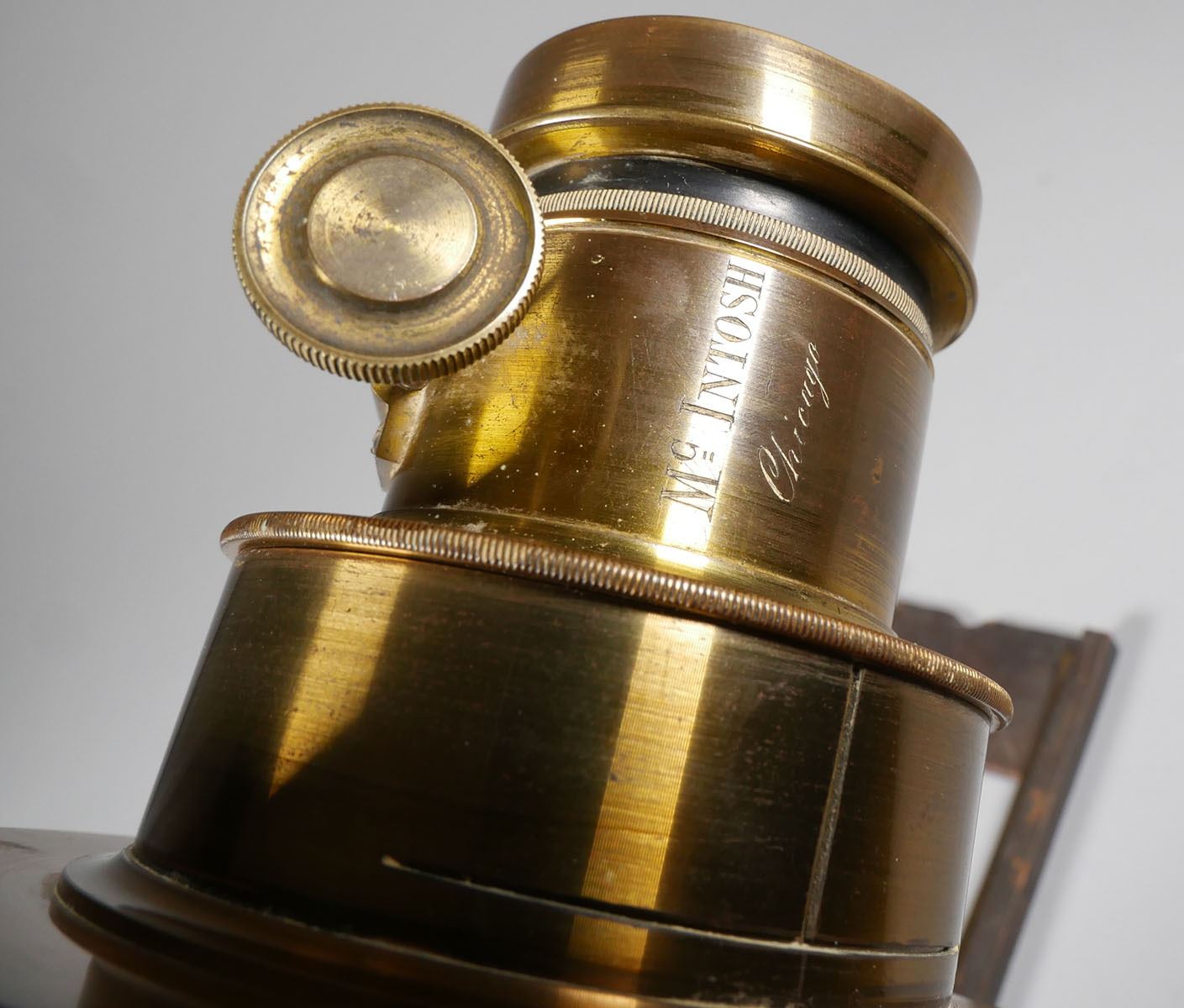 Antique McIntosh lens for magic lantern. Brass body measures 5" x 5 1/8". Two slide holders included. Finish has normal wear, scuff marks & surface oxidation. Lens has small ding on rim. Lens adjustment knob threads are stripped. See photos for more details on condition.