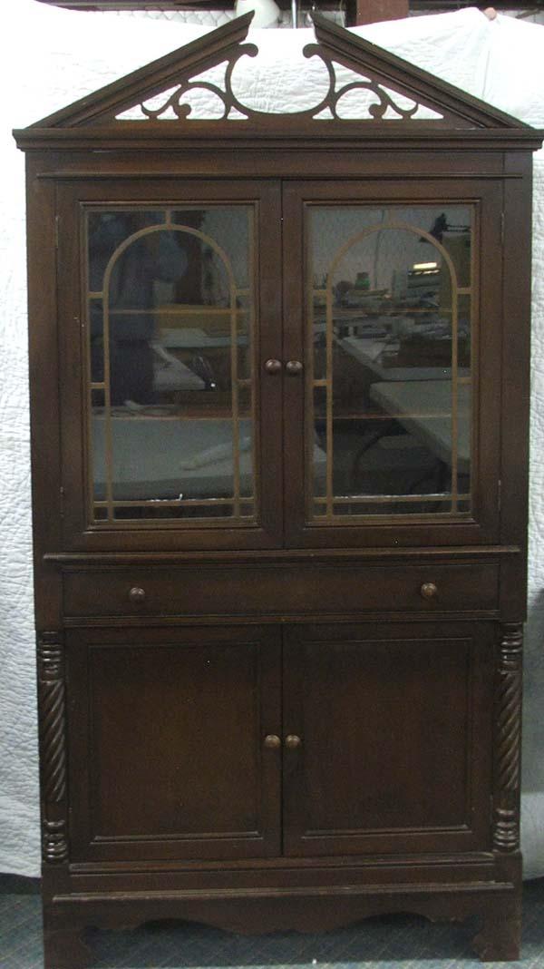 Antique Mahogany China Cabinet.MUST BE PICKED UP Glass front top half. 2 Wood shelves inside the top half, 1 drawer, 1 wood shelf on the bottom half. Measures approx. 74 1/3''H x 38''W x 16 1/3''D. MUST BE PICKED UP! Matches lot #1499B the Buffet.