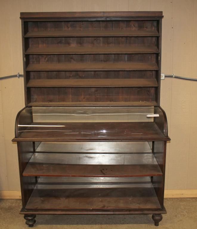 Consigner states that it came from a candy shop in England. Curved glass display area. Comes in three pieces. Base with feet measuring 7-1/2" tall, 22" deep and 49-1/4" wide. Display cabinet with two shelves and curved glass top measuring 33" tall, 21-3/4" deep and 49-1/4" wide. Top shelf unit with bottom shelf and four slanted shelves measuring 32" tall, 7-1/2" deep and 48" wide.