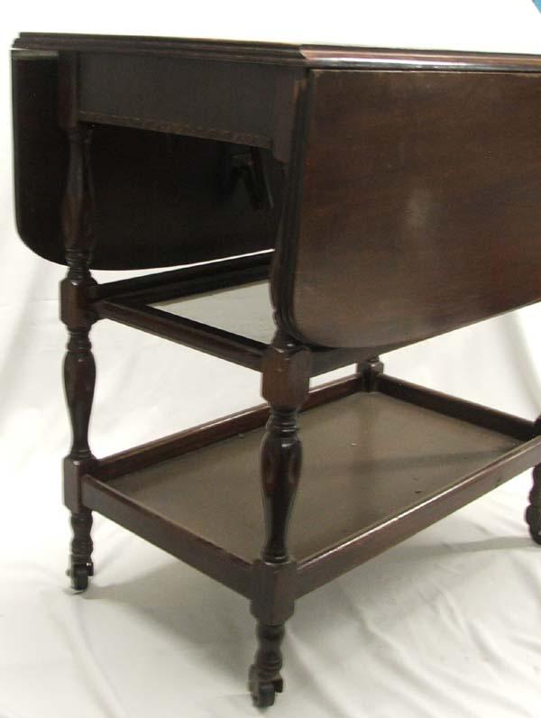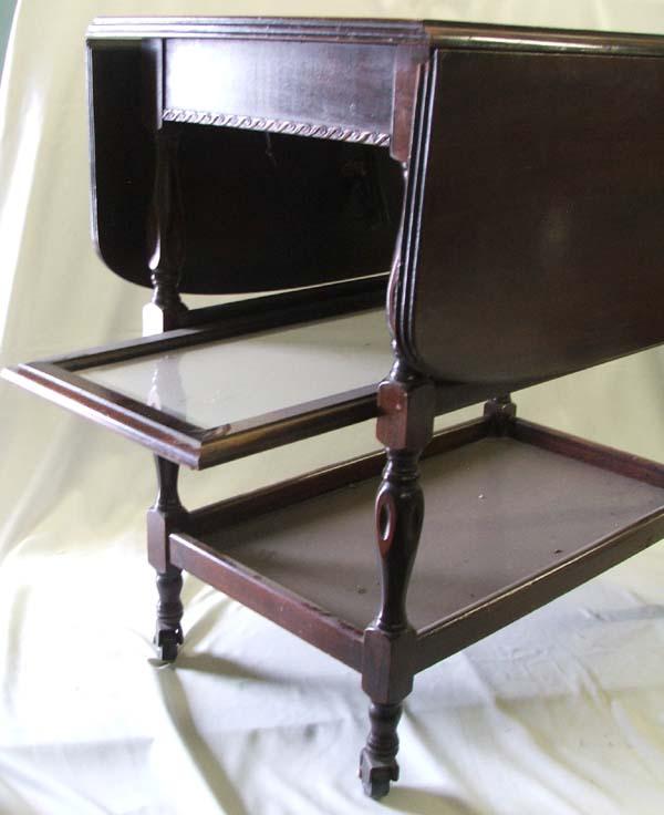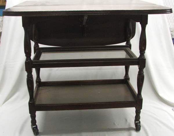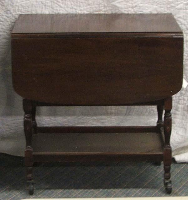 Antique Mahogany Drop Leaf Serving Table.Must Be Picked UP Glass shelf in the middle and wood shelf on the bottom. Measures approx. 28 1/4''H x 27 1/2''W x 38 1/2L with leaves extended. Original rollers on legs. MUST BE PICKED UP!