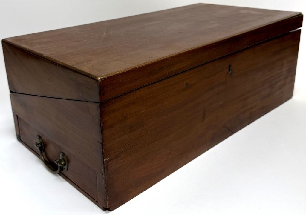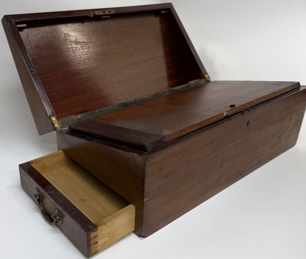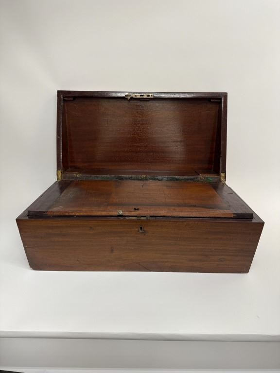 Antique traveling writing desks, or writing slopes, evolved from medieval writing boxes and gained popularity in the 17th and 18th centuries. Their popularity surged during the Victorian era due to increased literacy, with designs evolving to include lockable, portable boxes with fold-out surfaces for writing, and storing for supplies. Made from fine woods like mahogany, lap desks symbol of affluence and sophistication