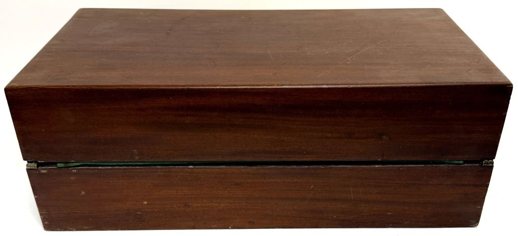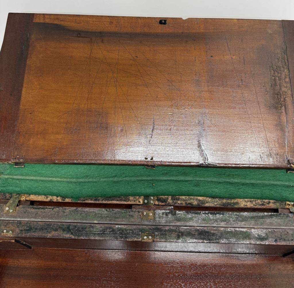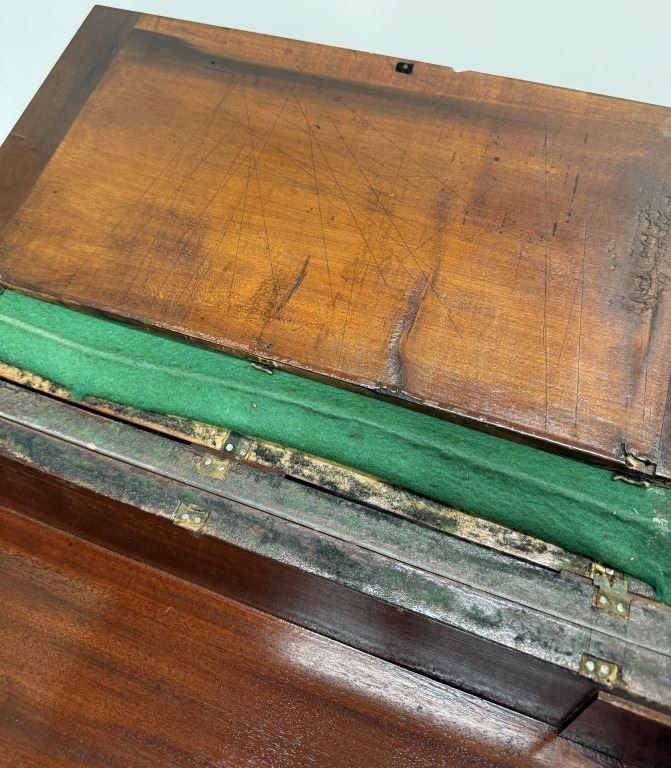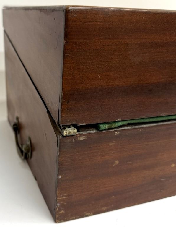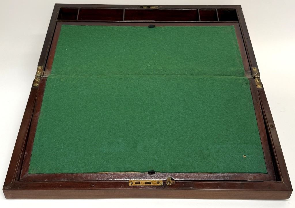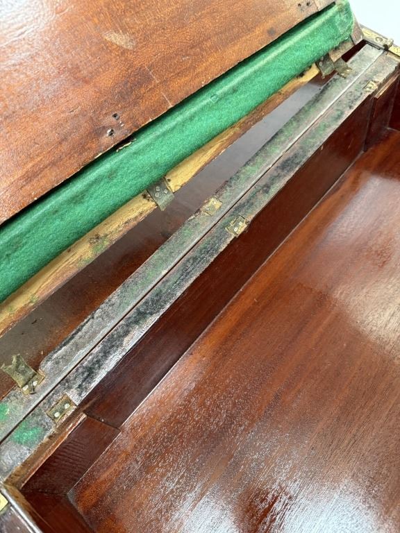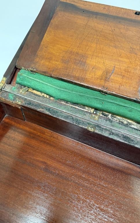 Item/Description: Featuring antique Mahogany traveling writing desk from the late 1800s. Features various compartments for writing materials, green felt matting, and a fold-out surface.