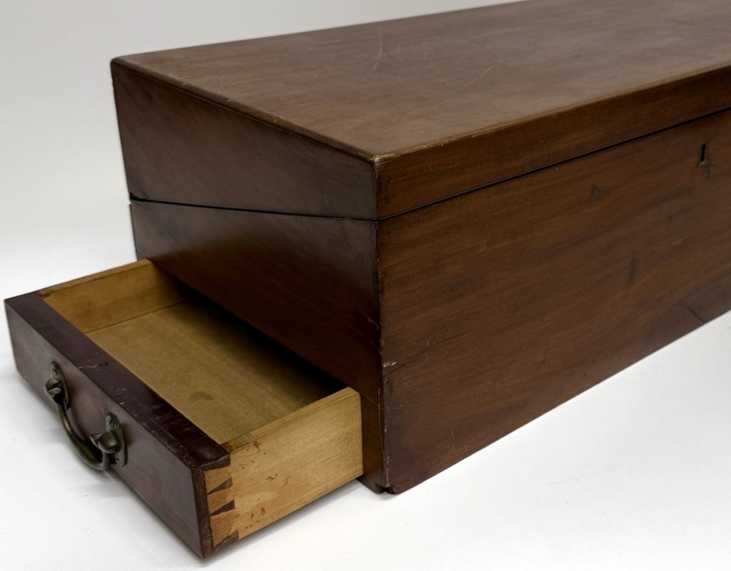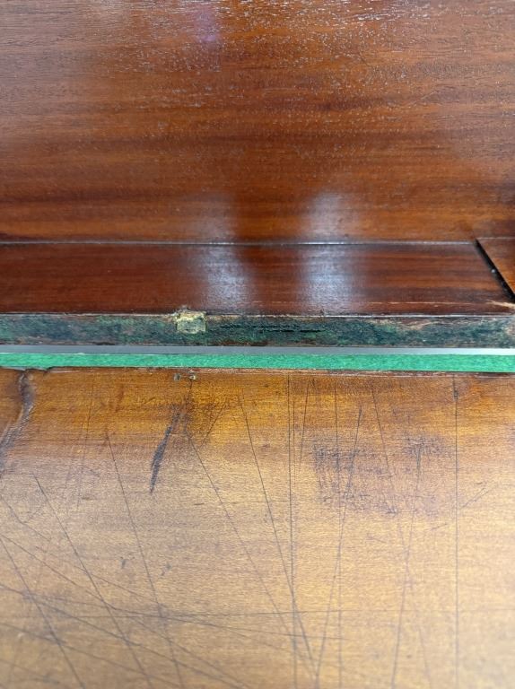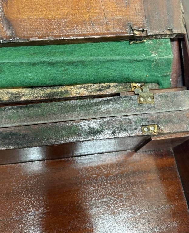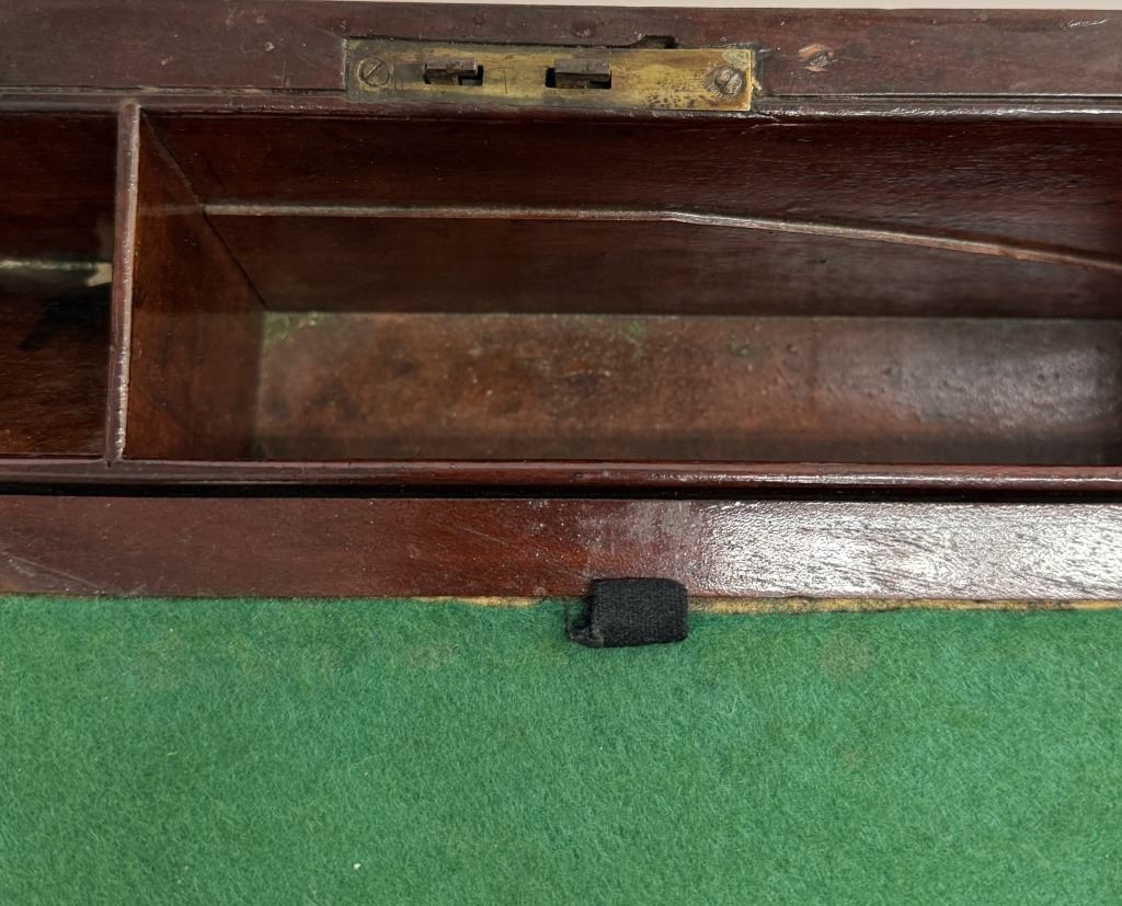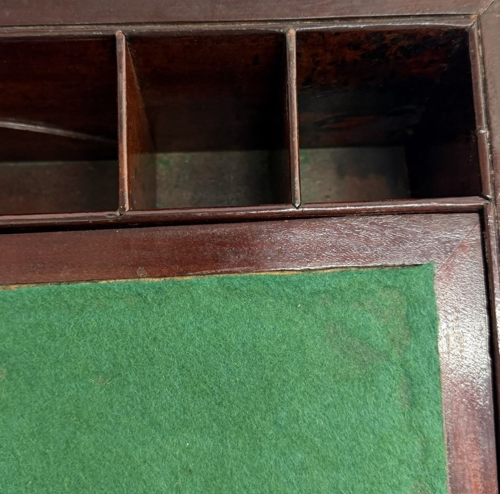Item/Description: Featuring antique Mahogany traveling writing desk from the late 1800s. Features various compartments for writing materials, green felt matting, and a fold-out surface.