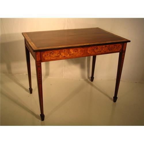 Unusual and elegant English two-drawer tea table having mahogany top and a banded border with inlaid bellflower, oval flowers and rosettes. Fitted with two drawers on opposing ends with inlaid vines and trumpets. Raised on four tapered, inlaid legs ending in spade feet. This table is very unusual and wonderfully elegant. The taper to the legs in addtion to the finely tapered spade foot make this table very distinctive.